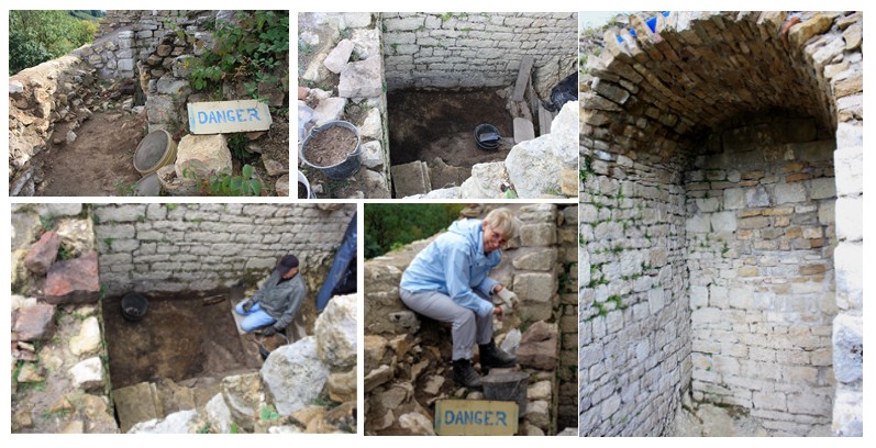 - Suite à l'éboulement du mur ouest de la cave 1, du aux intempéries (ou à des dégradations volontaires ou non), il a fallu enlever la terre puis dégager les pierres pour, enfin, re...découvrir le rest du mur et la porte, très dégradée, reliant la cave à la base ouest de la tour carrée. Un gros travail qui a nécessité une coordnation étroite entre les hommes forts et l'analyse pierre à pierre de la part de l'archéologue.
