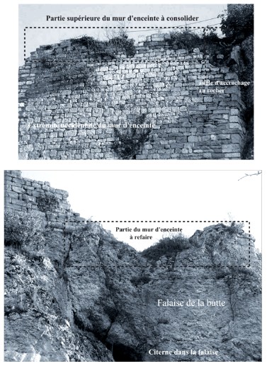 Consolidation du mur d’enceinte au Nord-ouest sur 5 m de long, 2 de haut et 1 m d’épaisseur