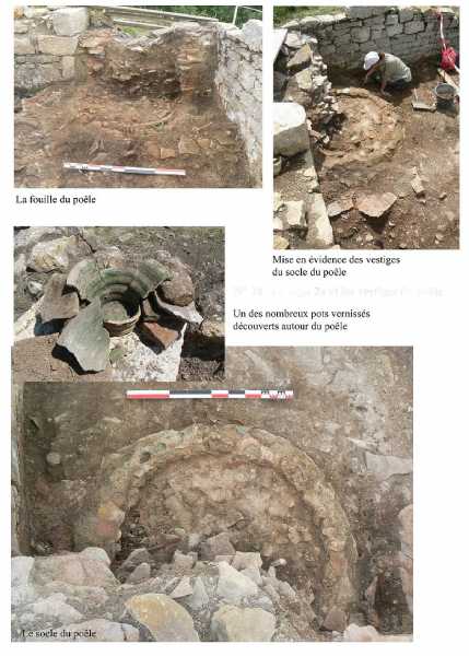 A l'angle de ces deux derniers murs subsiste toutefois un renfoncement marqué pour l'un des côtés  par une embrasure en grand appareil. La fouille des gravats a permis d'y détecter les traces d'un poêle, un système de chauffage peu connu en Franche Comté. De plan quasi circulaire, avec un diamètre de près d'un mètre, sa base est constituée de gros blocs appareillés, sans doute en remploi. La sole se devine de par un bourrelet rubéfié bien marqué, délimitant un espace interne circulaire également. L'élévation externe est détruite mais les éléments retrouvés dans les gravats permettent de proposer une paroi en pots ou gobelets liés par une chamotte de terre glaise.