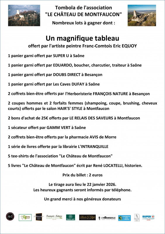 Vous pouvez vous procurer des billets auprès des membres de notre association. Le tirage aura lieu à Montfaucon le jeudi 22 janvier 2026 à l'occasion de la galette des rois partagée par nos adhérents.