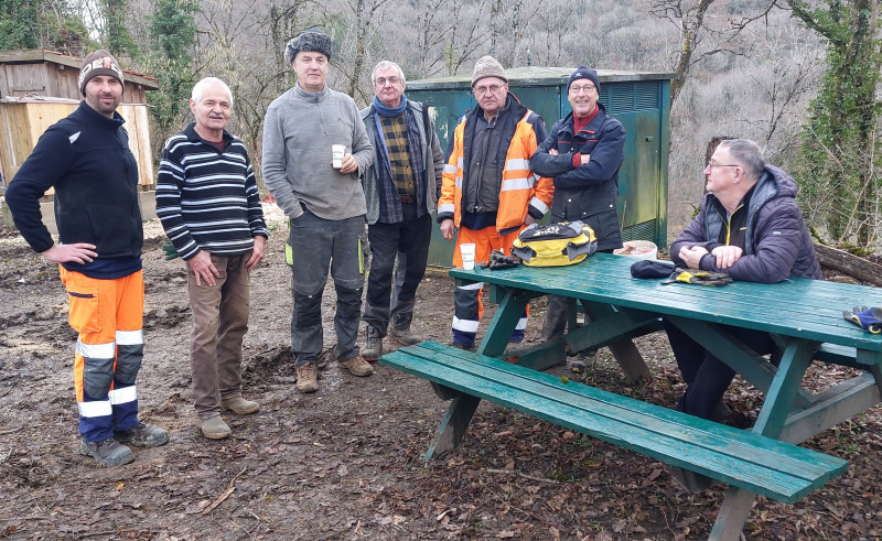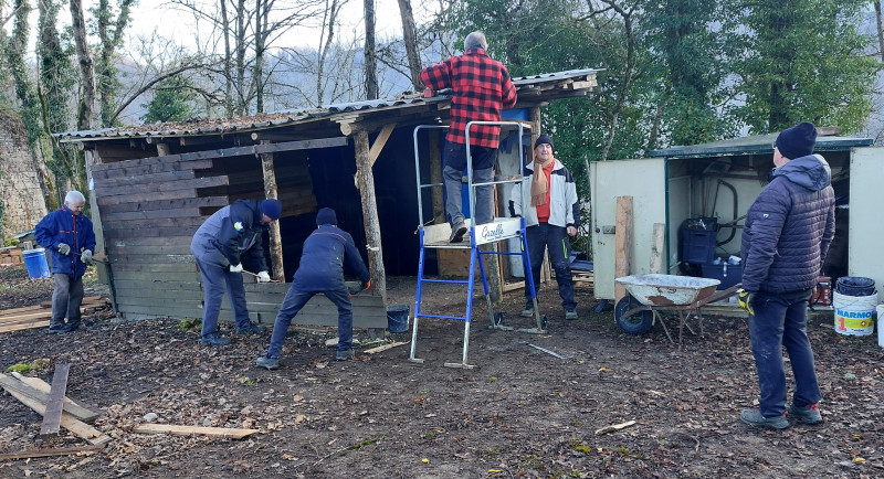 Cependant, avant de construire, il a fallu procéder à la démolition de l'ancienne cabane. C'est ainsi, que le 19 janvier 2026, une joyeuse bande de bénévoles s'est attelée au démontage, au tri sélectif des matériaux à garder ou à brûler, au brûlage proprement dit avec l'autorisation de la commune et des pompiers, au nettoyage des lieux, puis à la prise de mesures pour la nouvelle construction.