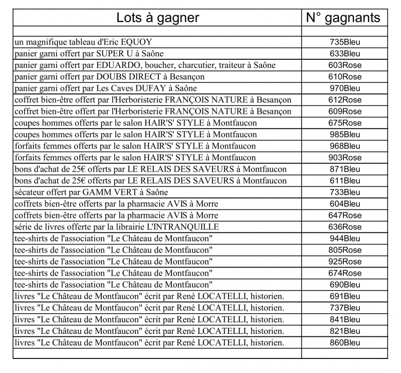 Liste des numéros gagnants de la tombola :
