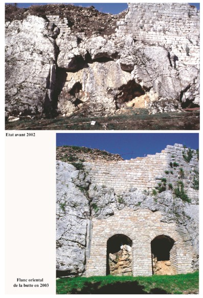 Colmatage de la brèche n° 3 de la façade Est, avec reconstruction partielle du mur d’enceinte sur une longueur d’environ 8 m, une hauteur moyenne de 3,5 m et une épaisseur pouvant atteindre plus de 2 m.