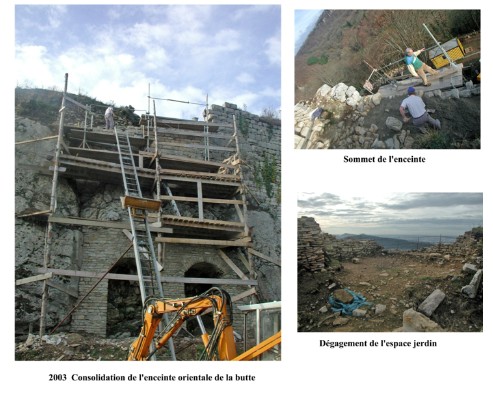 Consolidation des murs déjà dégagés aux abords de la porterie haute et de la voûte surplombant celle-ci, et de la base intérieure de la tour d'entrée.