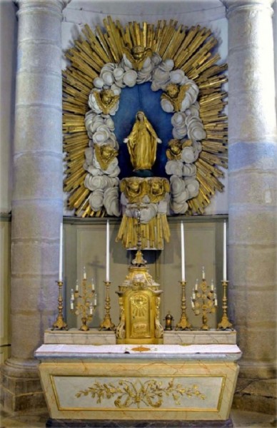 Cette Vierge en bois doré et polychromé du XVIIIe siècle a les bras ouverts et le visage tourné vers le bas , ses pieds posant sur le globe écrasent le serpent (symbole du démon)
