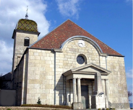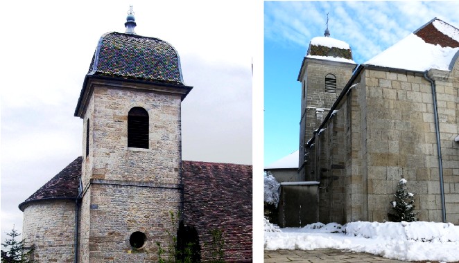 - Sur le côté septentrional s’élève le clocher : une tour carrée de 3 niveaux (les deux premiers aveugles, le 3ème percé de baies cintrées), coiffé d’un clocher comtois à tuiles vernissées.