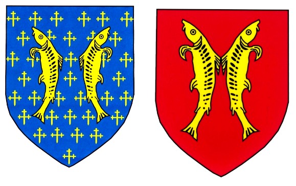 Armoiries des Montbéliard-Montfaucon (adoptées par la commune de Montfaucon) « De gueules à deux bars d’or adossés », c’est-à-dire un écu à fond rouge avec deux bars jaunes accolés par le dos. |