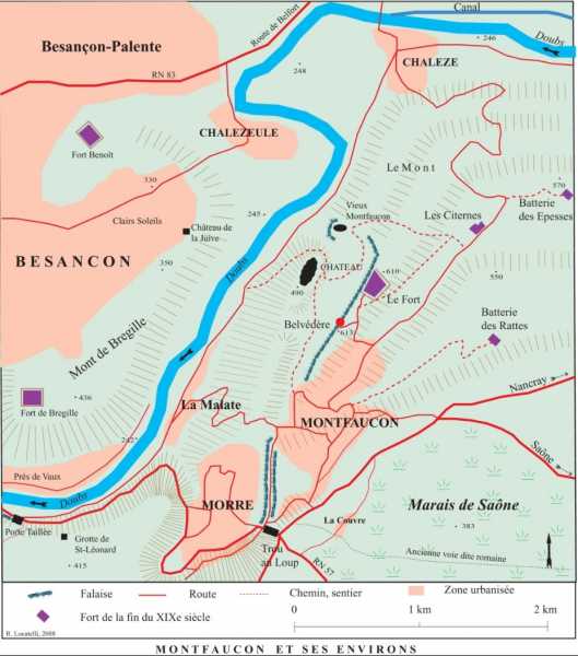Pour apprécier la beauté du site et l'importance des vestiges, le visiteur se rendra d'abord au belvédère de Montfaucon qui se trouve aux pieds même des antennes de TDF. De là, à 600 m d'altitude, il jouit d'un splendide panorama sur tout le Jura et, en particulier, sur le relief tourmenté du secteur bisontin, marqué par un chapelet de collines de verdure entre lesquelles se faufile le Doubs, avec, en arrière-plan, l'agglomération moderne qui s'étire de Palente à Planoise.