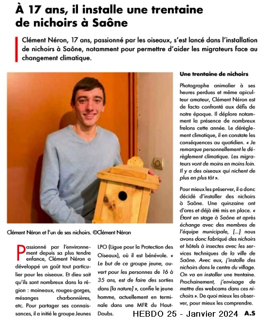 Après l'EST REPUBLICAIN le mois dernier, c'est au tour du magazine HEBDO 25 d'écrire un article sur Clément NERON, jeune membre de notre association. Sa passion pour les oiseaux le pousse à agir quasi quotidiennement pour les protéger en installant par exemple des nids à Montfaucon ou à Saône dernièrement. Bravo et félicitations à Clément, le Monsieur NATURE de notre association.