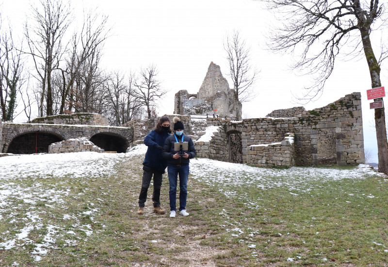 La première rencontre sur le terrain a permis à Adrien d'expliquer son travail sur le bourg et ses besoins en matière de photos, et à David de proposer ses compétences en matière de prises de vue par drone et de leur traitement possible à partir de logiciels sophistiqués. C'est le début d'une complicité qui va faire évoluer l'histoire du bourg et du site médiéval.
