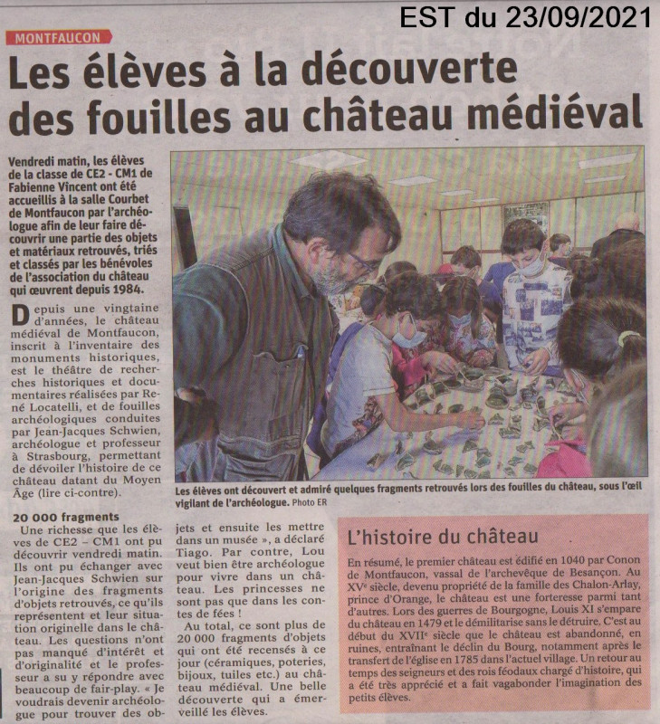 La classe de CE2/CM1 de Fabienne VINCENT est intéressée par les activités de notre association "Le Château de Montfaucon". Les élèves, accompagnés de leur professeur, ont tout d'abord bénéficié de la visite d'un atelier d'inventaire du mobilier trouvé au château avec des explications très pédagogiques de l'archéologue Jean-Jacques SCHWIEN (voir ci-dessous) ... des vocations pour les années futures???