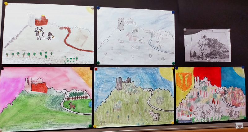 Merci à Fabienne VINCENT et à ses élèves pour tout l'intérêt qu'ils portent au patrimoine local et en particulier au château médiéval qui fascine toujours autant les enfants. Vous pourrez remarquer sur les dessins, que les enfants, en fins observateurs, n'ont pas oublié de mettre également en valeur "la nature" qui entoure le château, et notamment les vaches "du Guy et de la Malou" qui font partie intégrante du patrimoine naturel local.