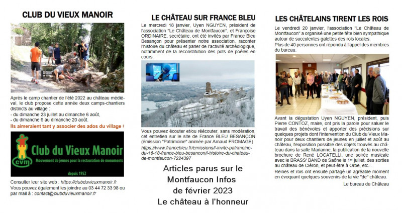 Le Montfaucon Infos de février 2023 fait la part belle à notre association et au château. Ce périodique est une belle vitrine pour le village et pour ses nombreuses associations. Vous pouvez y avoir accès sur le site de la Commune de Montfaucon ... cliquez sur l'image ci-dessous (les 3 articles sur le château) pour jeter un coup d'œil sur celui de février 2023!