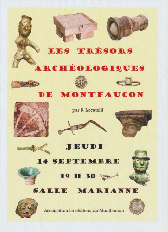 En accord avec la commune de Montfaucon, une présentation du mobilier trouvé au château aura lieu sous forme de diaporama le jeudi 14 septembre 2023 à 19h30 à la mairie de Montfaucon (salle Marianne). L'inventaire préparé par René LOCATELLI, Françoise ORDINAIRE et Michèle QUEUCHE à partir du travail de Jean-Jacques SCHWIEN, archéologue, sera présenté par René.
