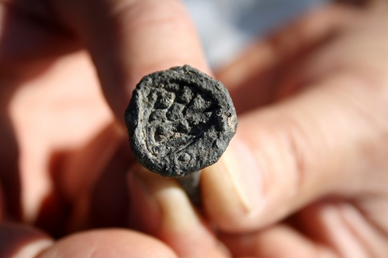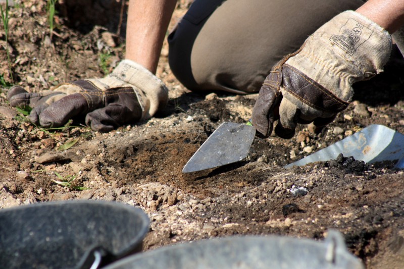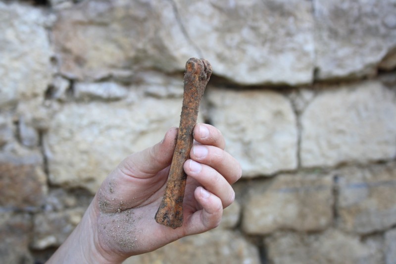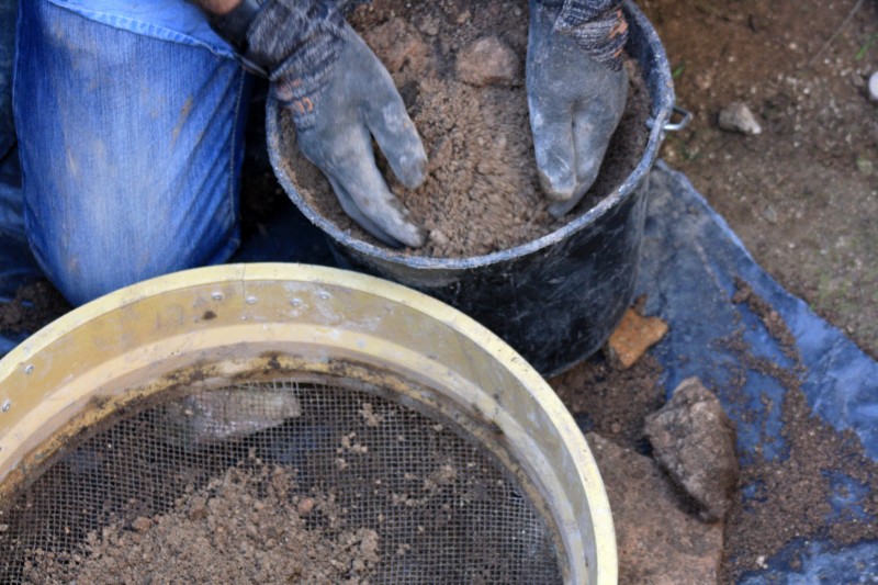 Tout près d'eux, dans leur "trou", deux "apprentis archéo" s'attèlent à chercher à la truelle le sol de la très haute salle voûtée (cave ou dépotoir?) de la tour carrée. C'est un travail minutieux qui demande beaucoup d'attention; il faut parfois utiliser le tamis pour vérifier qu'il n'y ait pas un petit morceau d'os, un minuscule tesson ou autre objet intéressant.