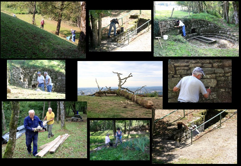 Au pied de la fontaine située au bord du chemin, un bénévole nettoie les pierres "encrassées" par la mousse. Pas facile de gratter à la main cette structure mais pas question de décaper au Karcher, c'est trop fragile! Seule, l'huile de coude" permet à ce bel ensemble de retrouver ses couleurs d'antan! Pendant ce temps, d'autres bénévoles "retapent" la barrière en bois mise à mal par les intempéries (ou autres causes), nettoient les alentours pour donner à ce site une image des plus correctes.