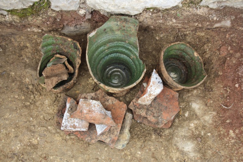 Tout près, des fouilles très fines font apparaître d'admirables structures sous cet ensemble voûté. Une fenêtre avec meurtrière "voit le jour"; un conduit est dégagé : peut-être des latrines! Peut-être pas! Encore une énigme qui nous tient en haleine et qui sera élucidée après étude de l'ensemble par notre archéologue. Suite en juin 2015!
