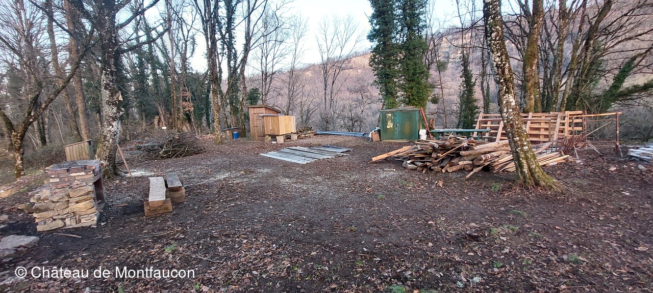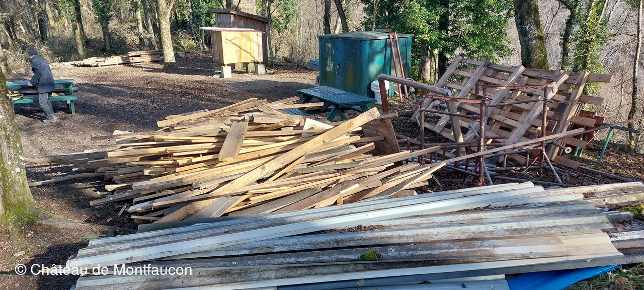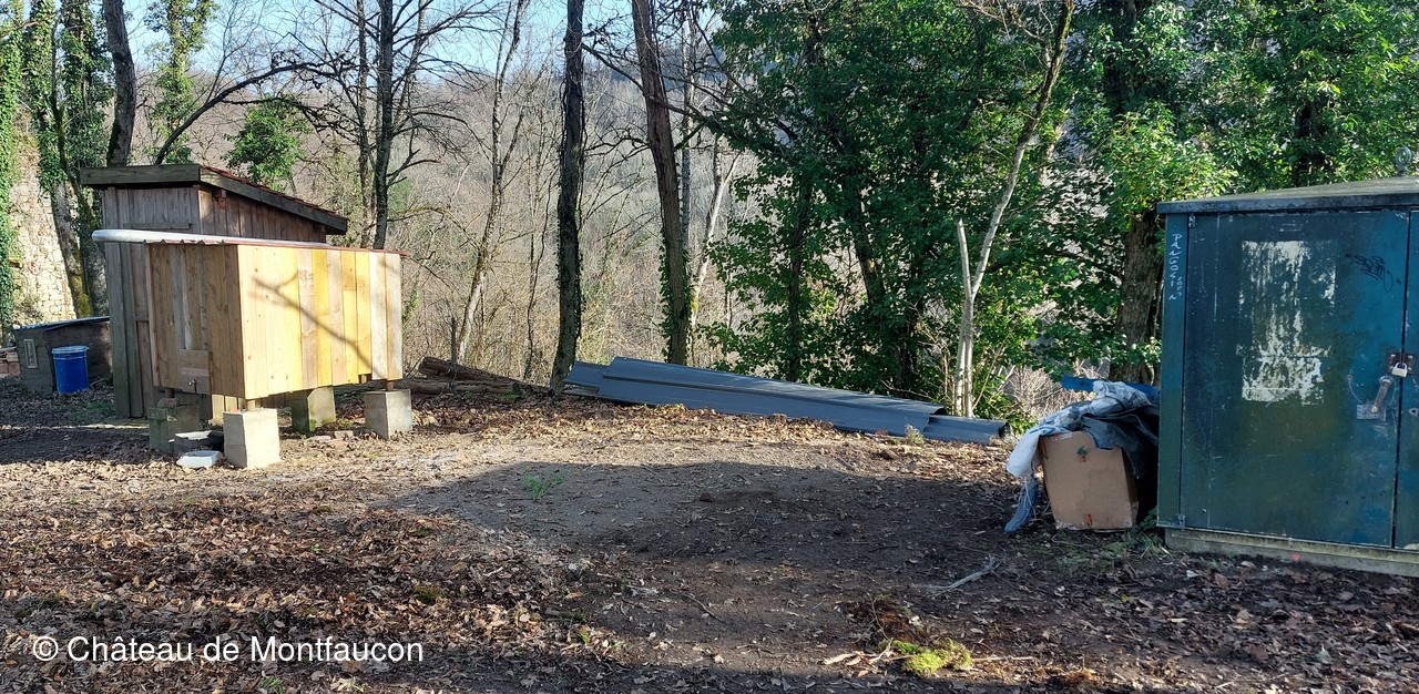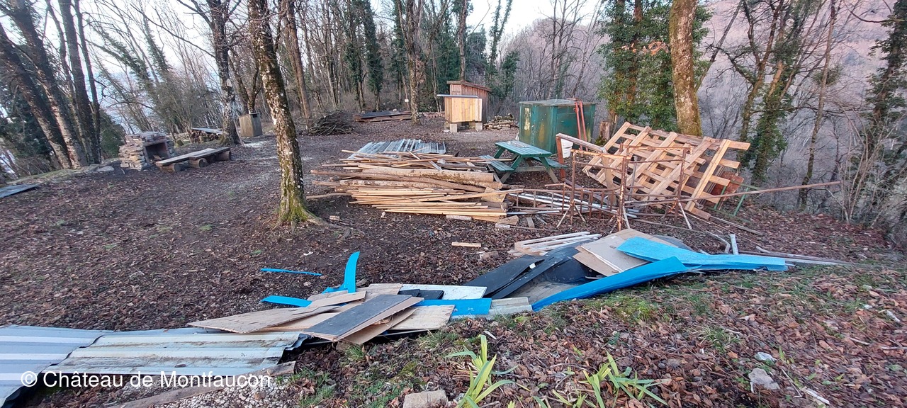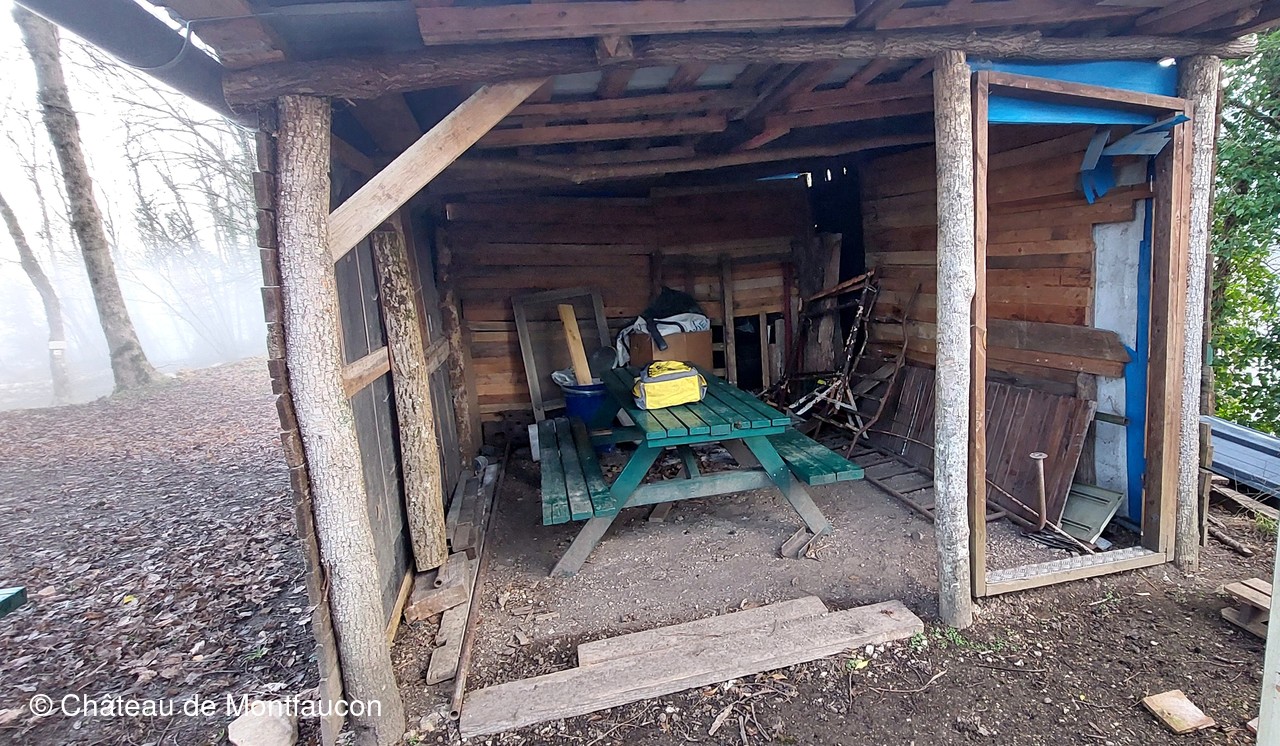 La Commune de Montfaucon, propriétaire des lieux, ayant accepté notre projet, nous avons procédé à la démolition de cette ancienne cabane : démontage - tri des matériaux - brûlage avec autorisation de la commune et des pompiers - nettoyage des lieux - prise de mesures pour la construction du nouvel abri.