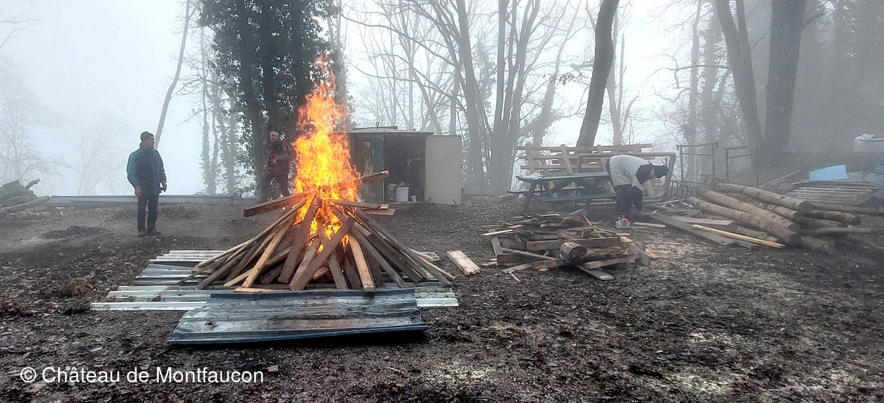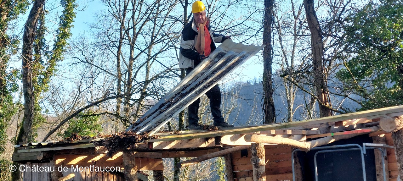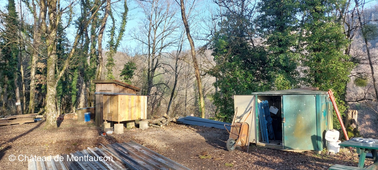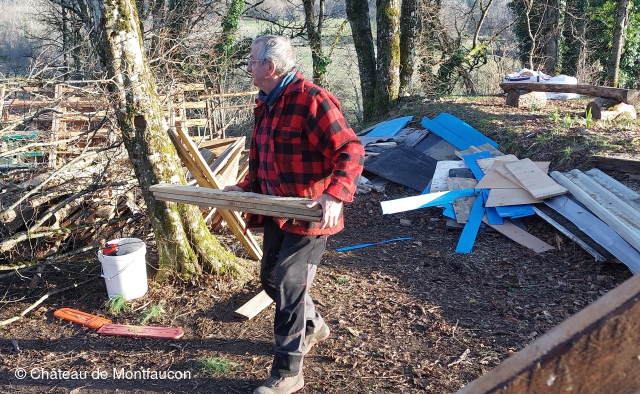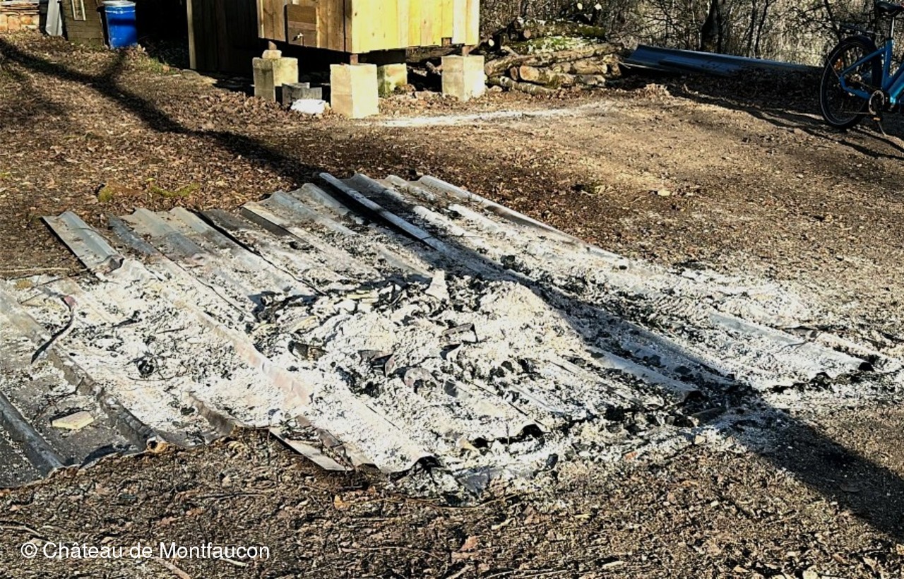 La Commune de Montfaucon, propriétaire des lieux, ayant accepté notre projet, nous avons procédé à la démolition de cette ancienne cabane : démontage - tri des matériaux - brûlage avec autorisation de la commune et des pompiers - nettoyage des lieux - prise de mesures pour la construction du nouvel abri.