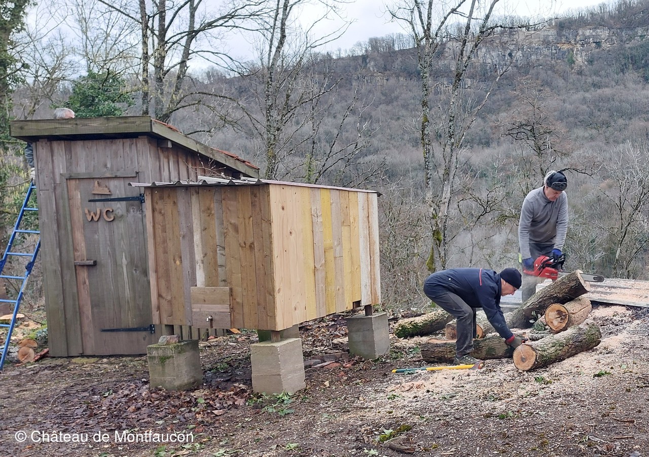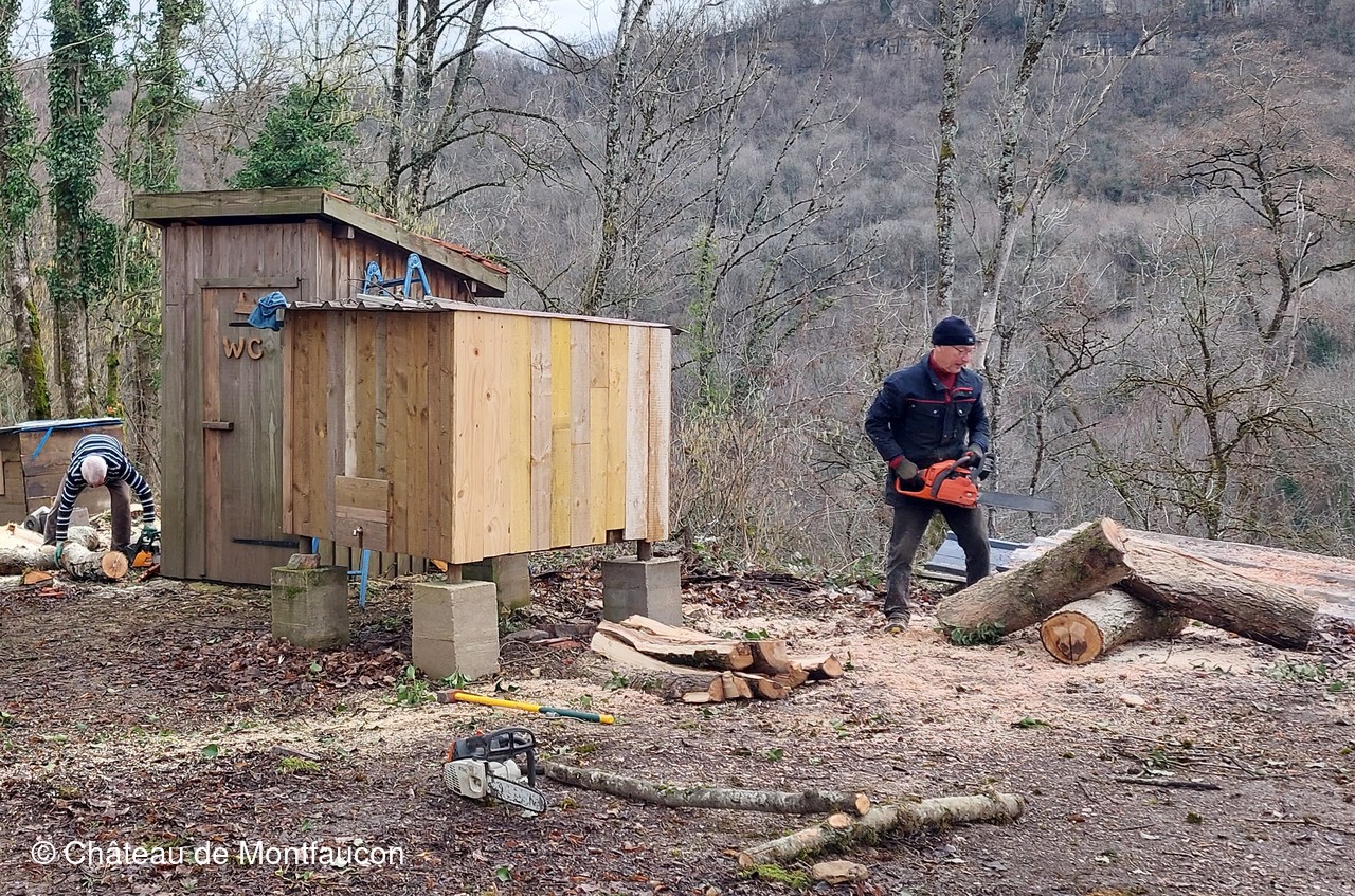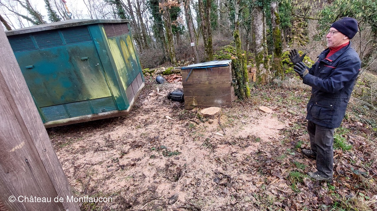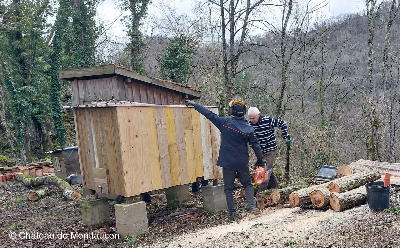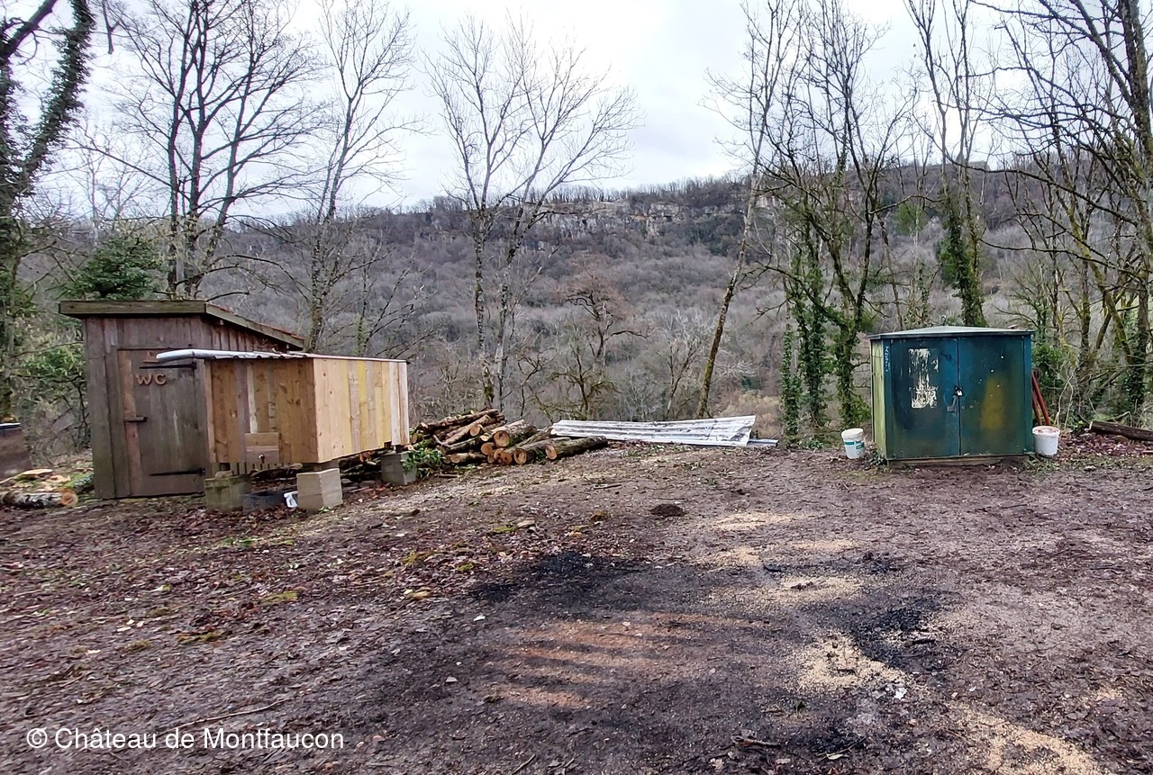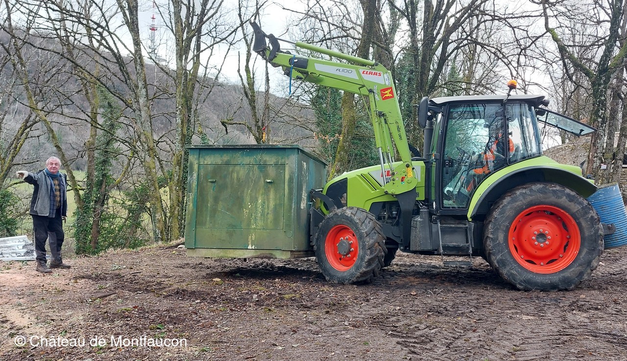 - dégagement de l'emplacement où se situera la cabane ( déplacement de l'abri en fer, coupe et enlèvement des coupes de bois
