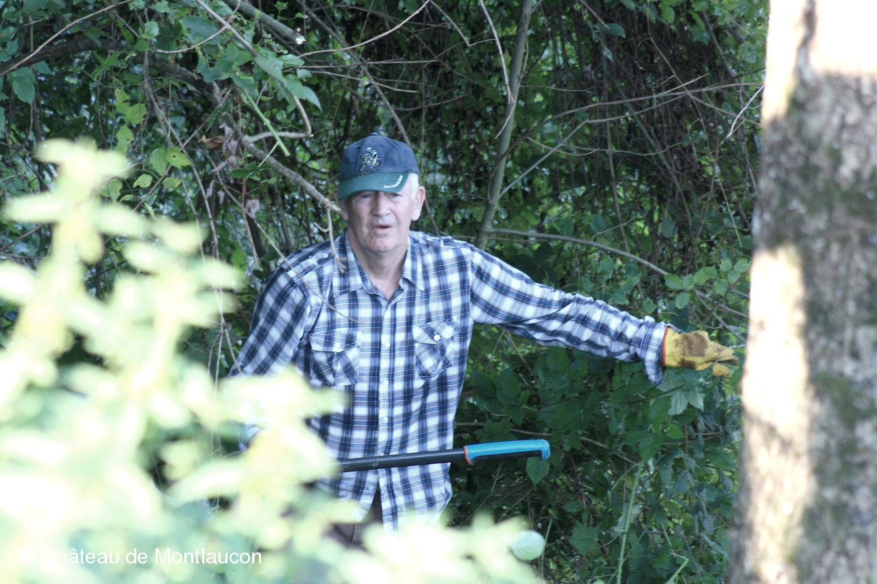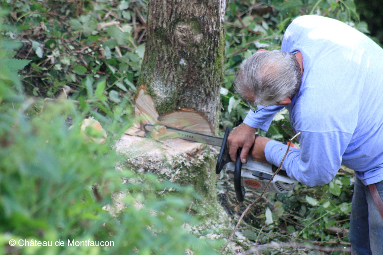 Au cours de cette matinée de chantier du samedi 6 septembre, Pierre et son équipe ont décidé, sous couvert du Président et des mebres de son bureau, de nettoyer la pente versant ouest du château de Montfaucon. C'est ainsi que tronçonneuse et cisailles ont été sorties pour abattre les trois ou quatre arbres qui cachaient la tour d'entrée et nettoyer les lieux.