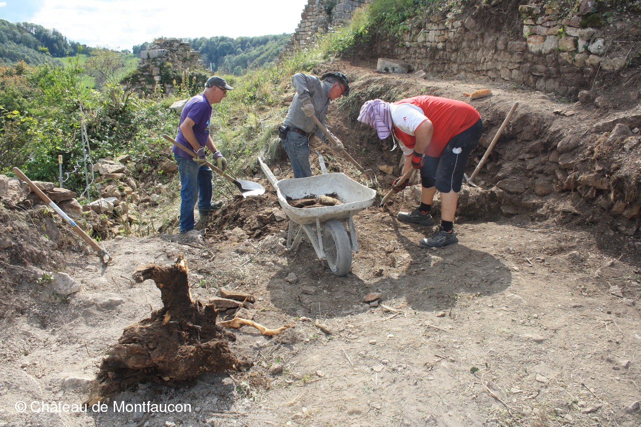 Le super travail des bénévoles permet de découvrir de nouvelles traces du passé. La chaleur qui règne sur les hauteurs de la butte castrale ne les empêche pas de manier la pioche, la pelle, la brouette et le seau sous l'oeil vigilent de Jean-Jacques SCHWIEN, notre archéologue. Lorsqu'une stucture apparaît, il n'est pas question de continuer ce travail "de force", il faut passer à la truelle, à la balayette pour un travail plus minutieux. C'est ce travail collectif et coordonné qui permet la réalisation de belles découvertes imposantes, telles que des murs ou des colonnes par exemple, que d'objets plus petits, bien que très rares tels que des épingles ou de petites vertèbres de poissons.