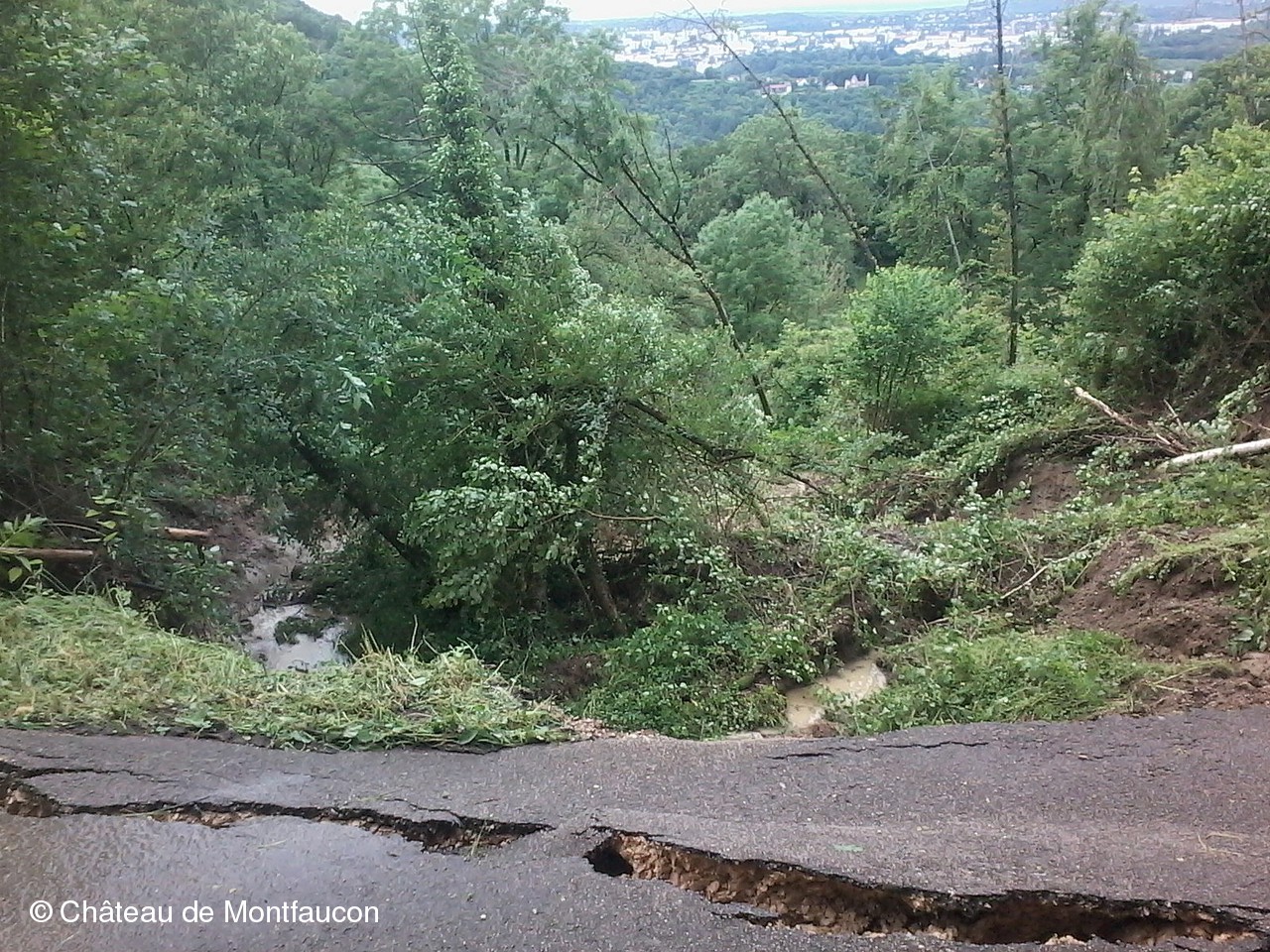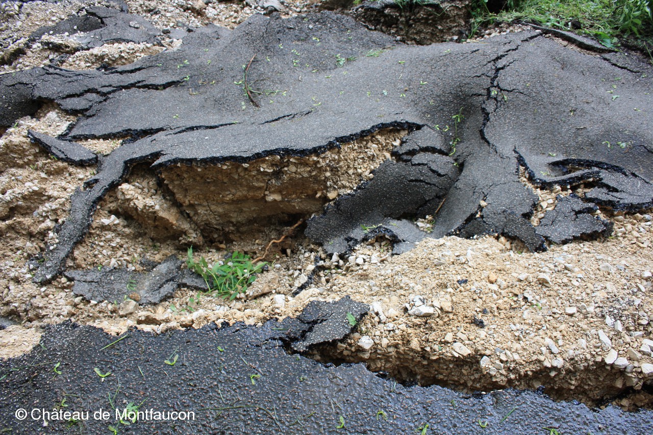 Après les fortes pluies qui arrosent notre région depuis maintenant des semaines, un important glissement de terrain a détruit une partie du chemin du donjon qui mène au château. Les dégâts sont importants et les travaux de réfection s'annoncent longs et très onéreux pour la Commune. Dans un premier temps, le maire a interdit l'accès à tous véhicules (route barrée) et sécurisé les lieux. Au niveau de notre association, l'annulation de la semaine de chantier de juin a été bien entendu décidée même si c'est avec un certain pincement au cœur!