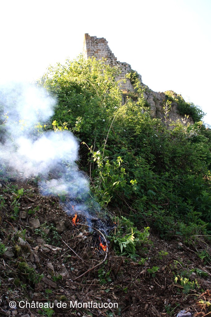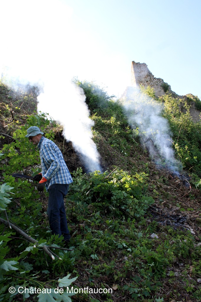 Les habitants de Montfaucon se sont inquiétés de voir de la fumée sortir des vestiges du château de Montfaucon en ce samedi 27 mai 2017! Ils ont été rassurés en sachant qu'il s'agissait tout simplement de quelques bénévoles de l'association qui entretenaient le versant ouest du site. L'épareuse/débrousailleuse étant passée il y a quelques semaines, il fallait "des bras" pour affiner le travail effectué par "la machine". Sous la responsabilité de Pierre MOREL, responsable des travaux du samedi, quelques bénévoles ont donc retroussé les manches pour s'atteler à cette tâche plutôt périlleuse ... qu'il conviendra de poursuivre lors de la semaine de chantier de juin tant la tâche est énorme! Un grand bravo et un grand merci à eux.