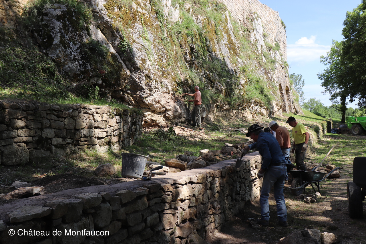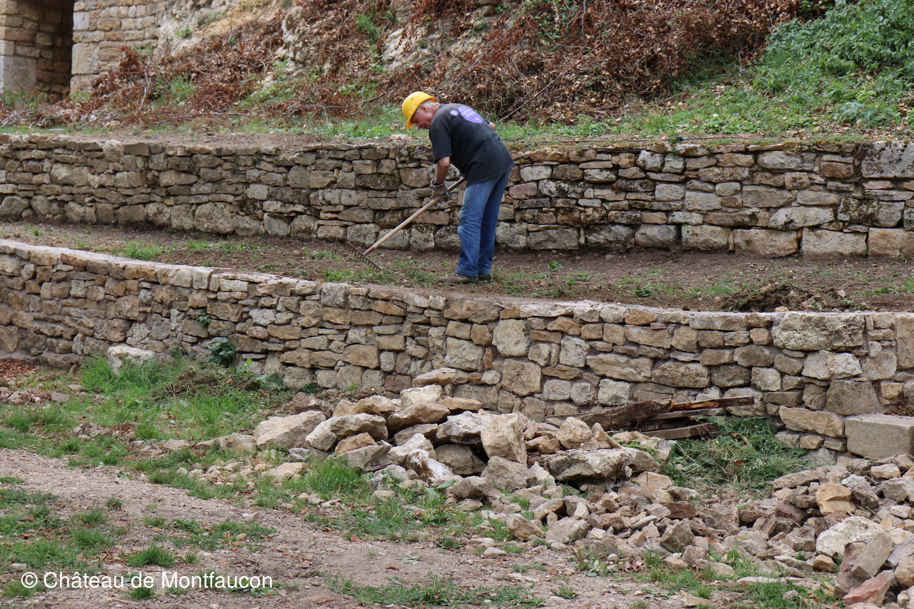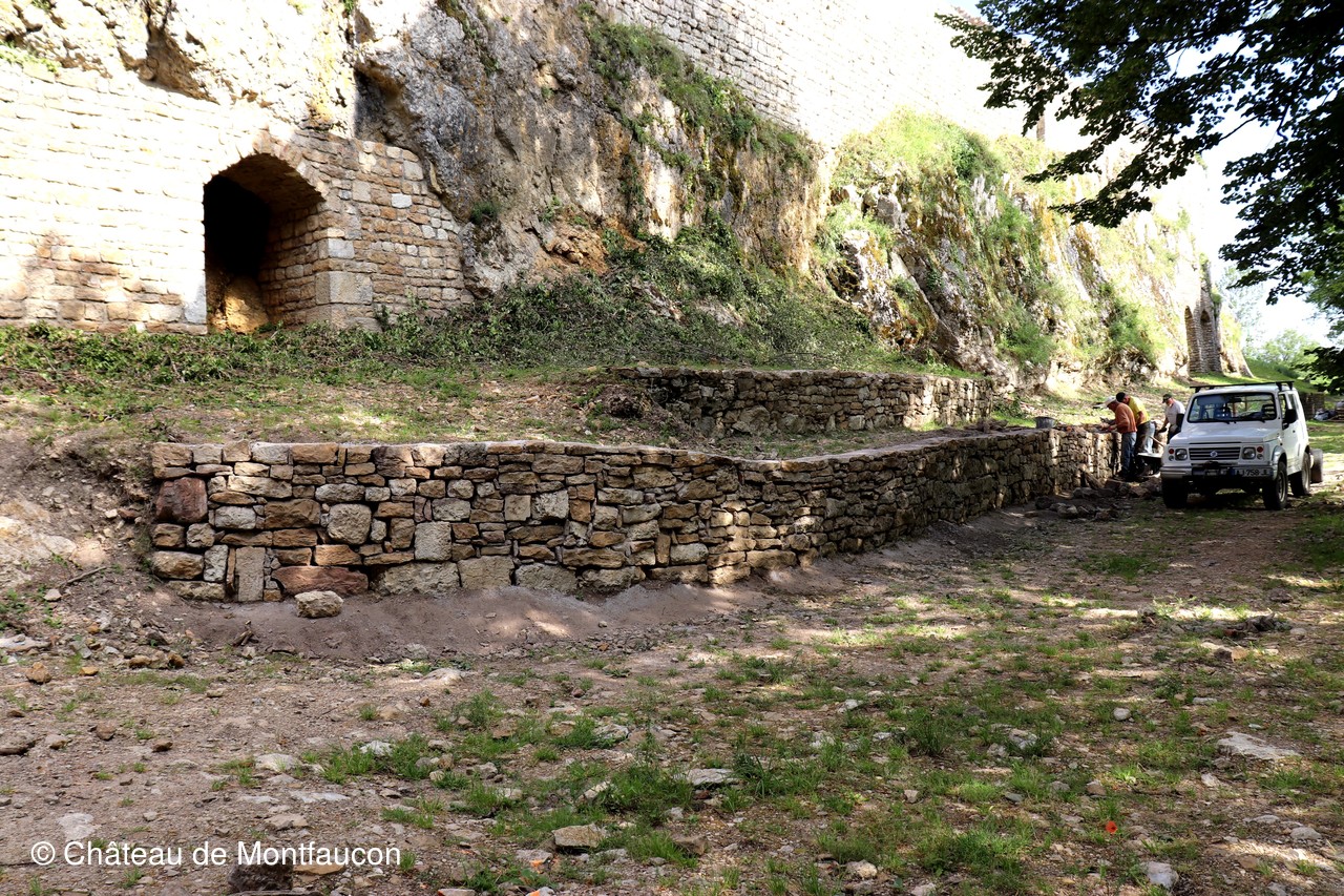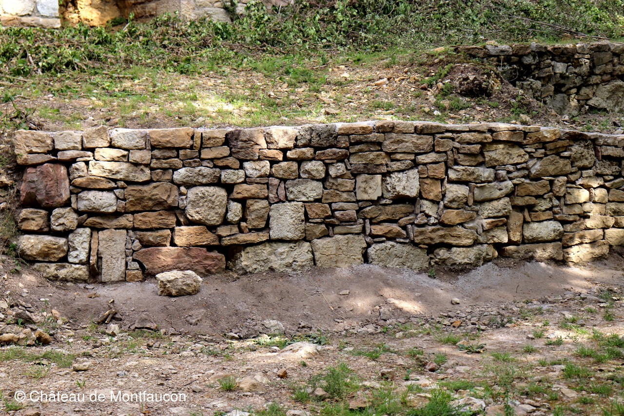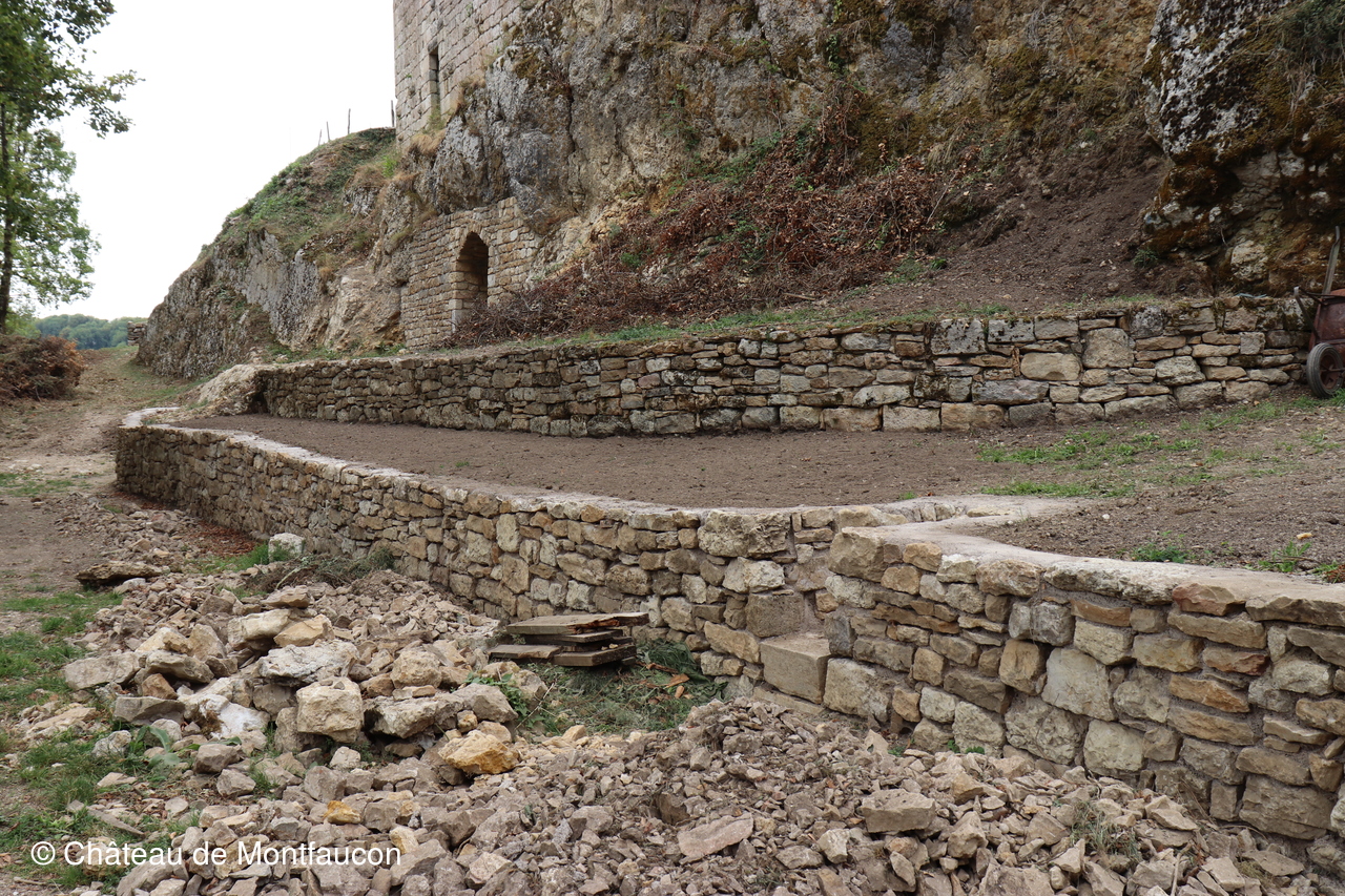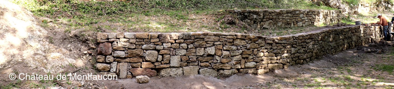 Lors des semaines de travaux au château de Montfaucon, une équipe a commencé à remettre en place le muret éboulé suite aux travaux des années précédentes. C'est un travail remarquable qu'ont effectué les bénévoles, tantôt maçons, tantôt jardiniers. Le muret n'est pas terminé, il reste encore quelques mètres à réaliser, mais le résultat est superbe. Les quatre premières photos montrent l'état de l'esplanade avant l'enlèvement des déblais; l'article ci-dessous vous en dira plus sur les travaux de déblaiement en septembre 2017 :