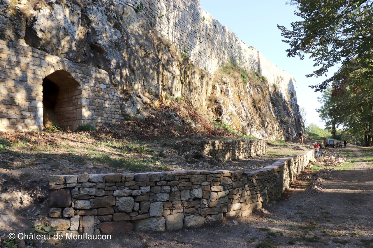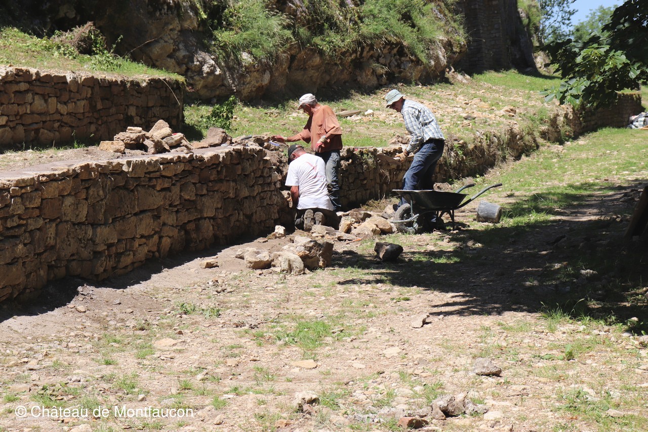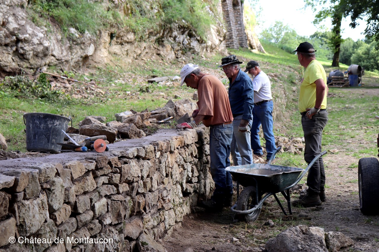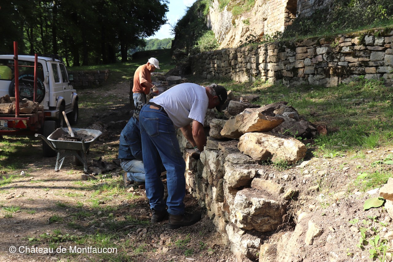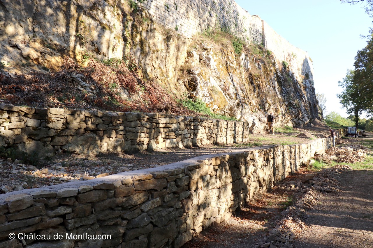 Lors des semaines de travaux au château de Montfaucon, une équipe a commencé à remettre en place le muret éboulé suite aux travaux des années précédentes. C'est un travail remarquable qu'ont effectué les bénévoles, tantôt maçons, tantôt jardiniers. Le muret n'est pas terminé, il reste encore quelques mètres à réaliser, mais le résultat est superbe. Les quatre premières photos montrent l'état de l'esplanade avant l'enlèvement des déblais; l'article ci-dessous vous en dira plus sur les travaux de déblaiement en septembre 2017 :