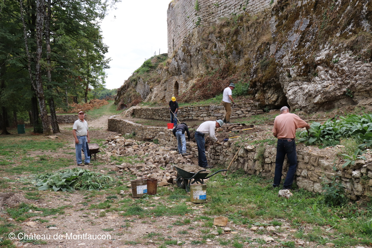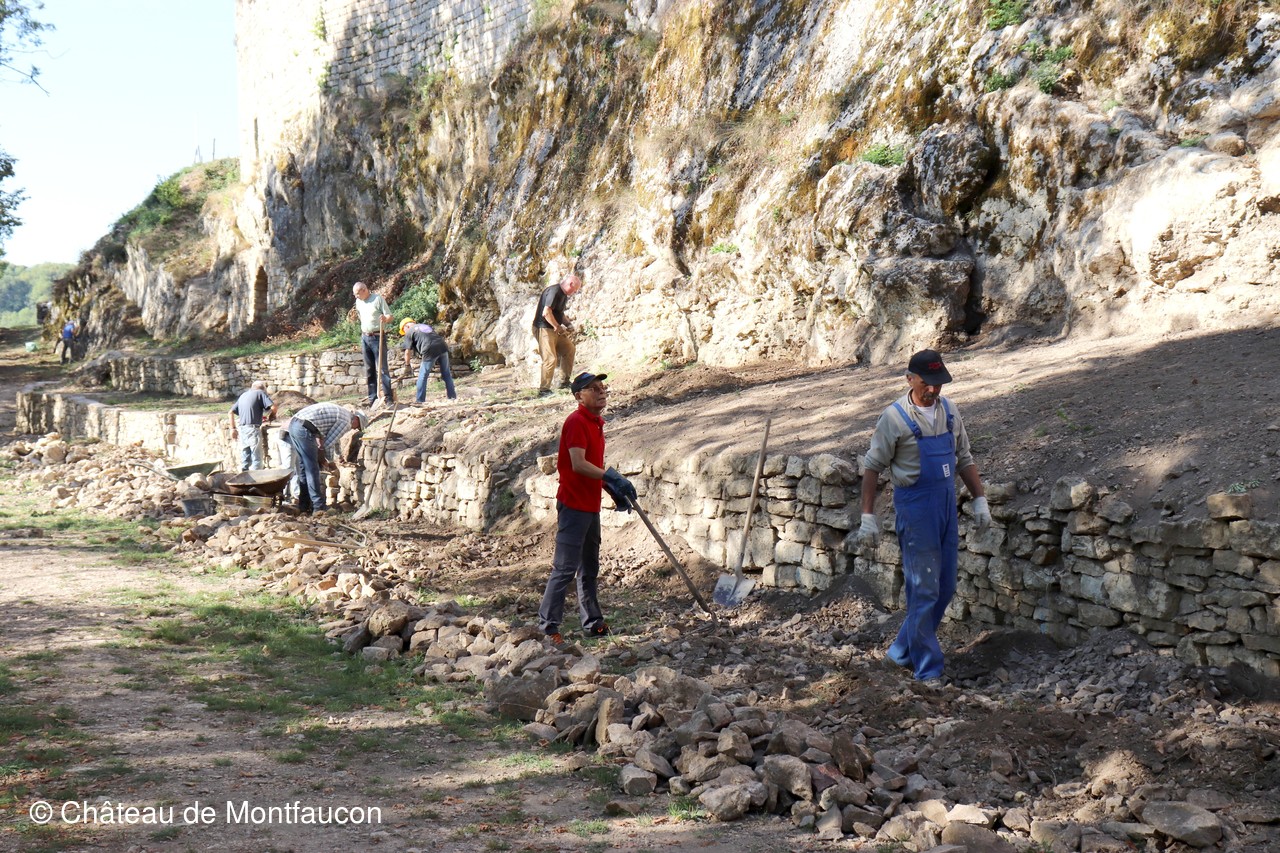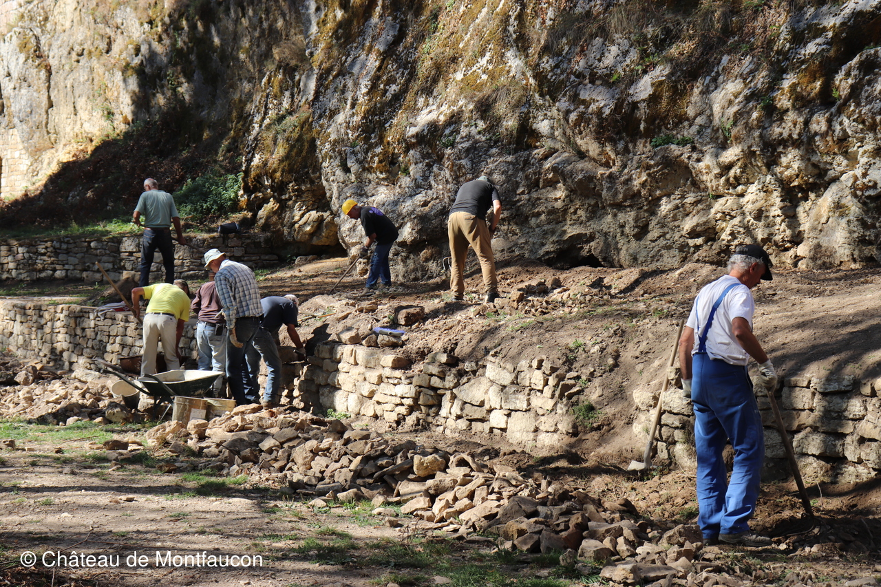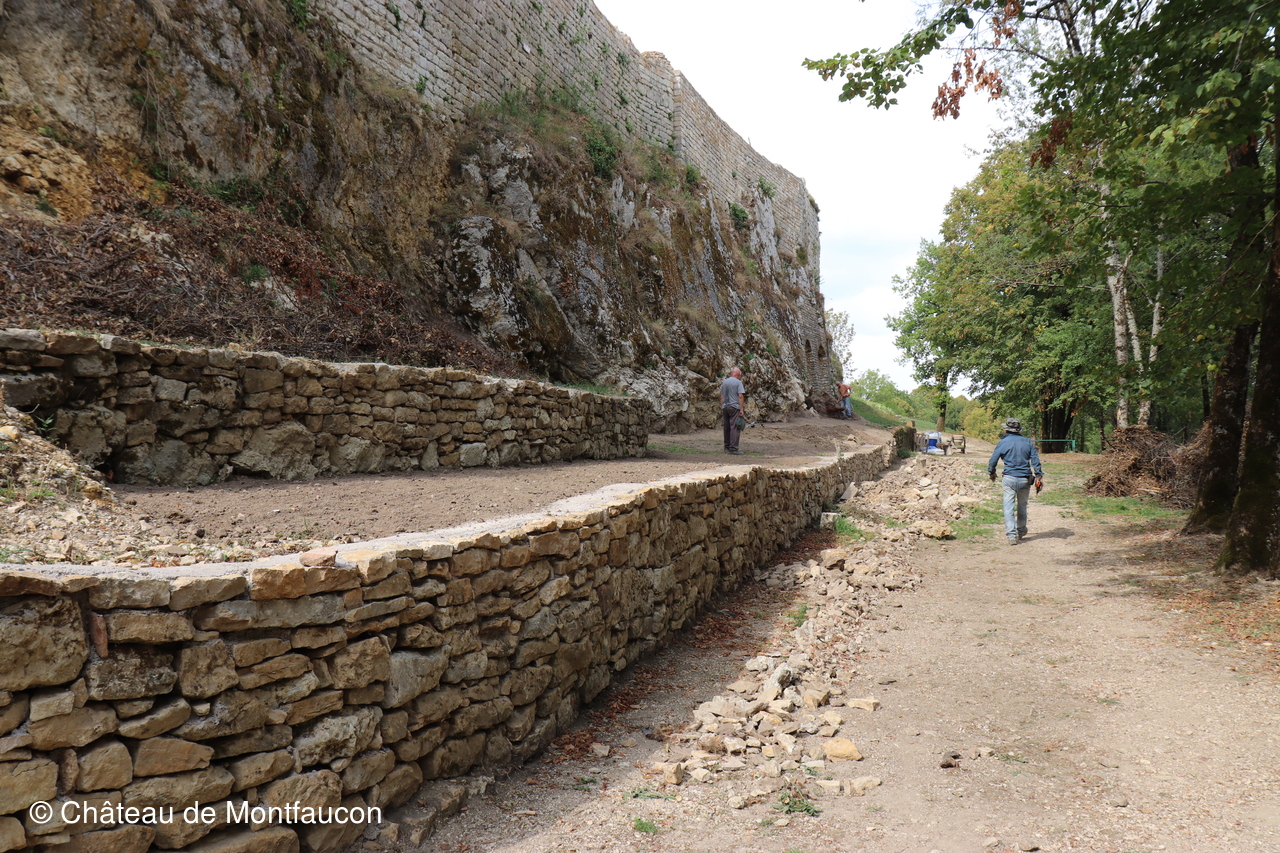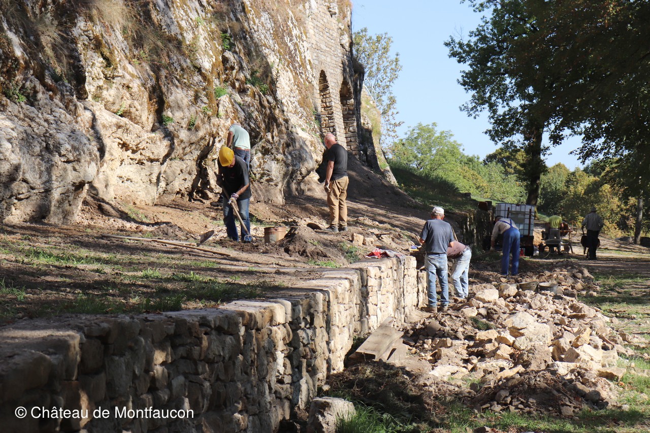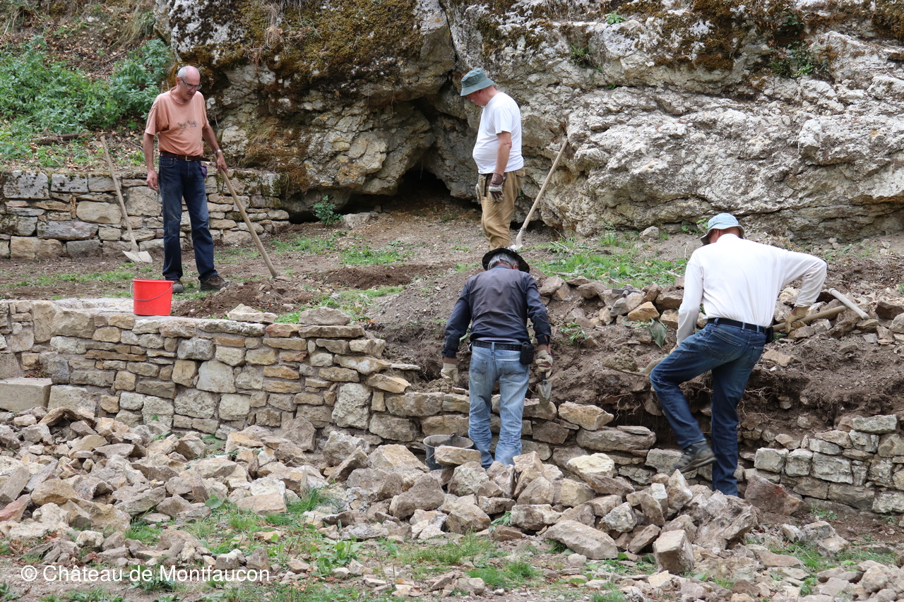 Lors des semaines de travaux au château de Montfaucon, une équipe a commencé à remettre en place le muret éboulé suite aux travaux des années précédentes. C'est un travail remarquable qu'ont effectué les bénévoles, tantôt maçons, tantôt jardiniers. Le muret n'est pas terminé, il reste encore quelques mètres à réaliser, mais le résultat est superbe. Les quatre premières photos montrent l'état de l'esplanade avant l'enlèvement des déblais; l'article ci-dessous vous en dira plus sur les travaux de déblaiement en septembre 2017 :