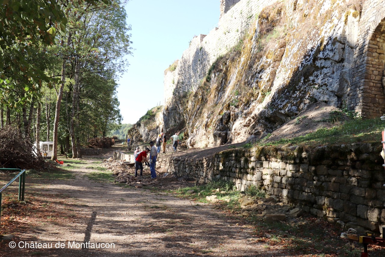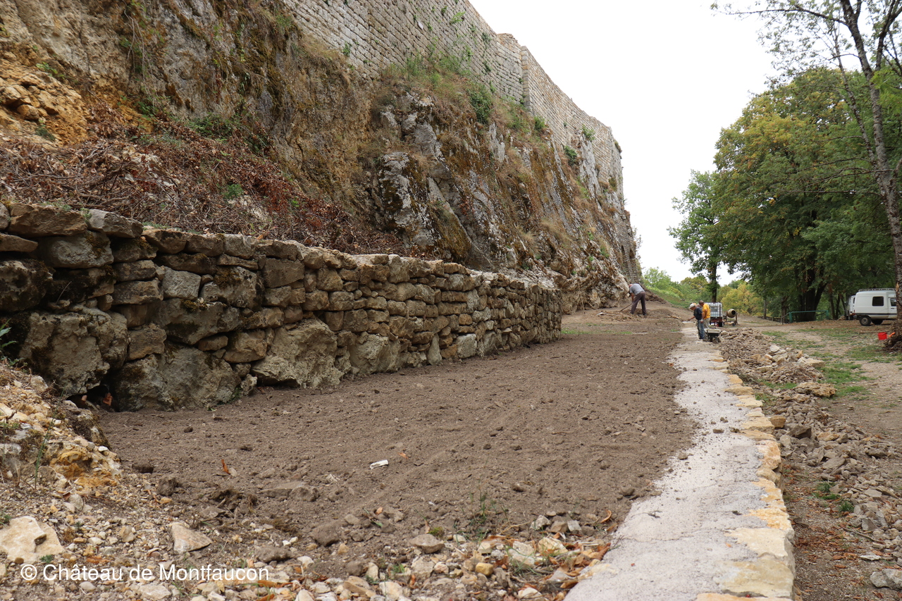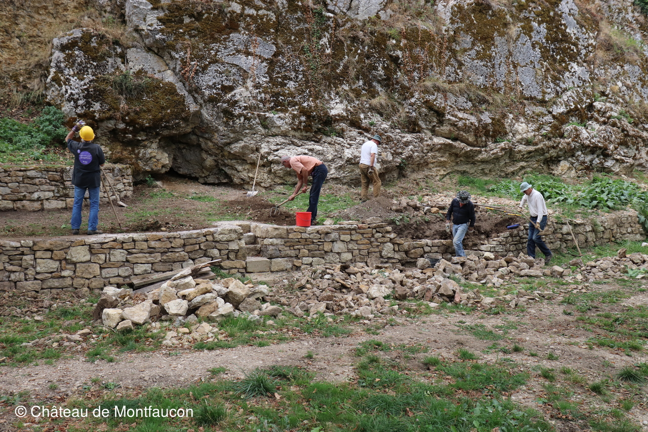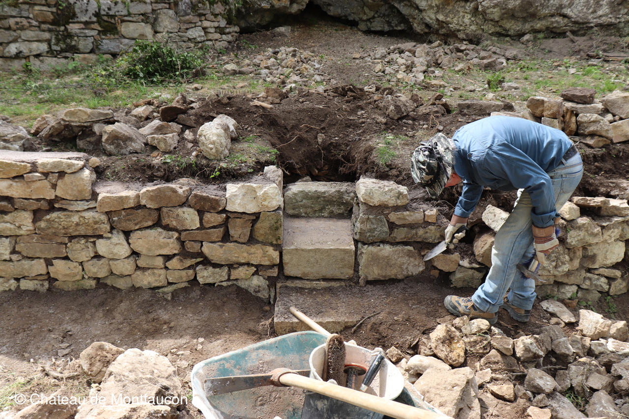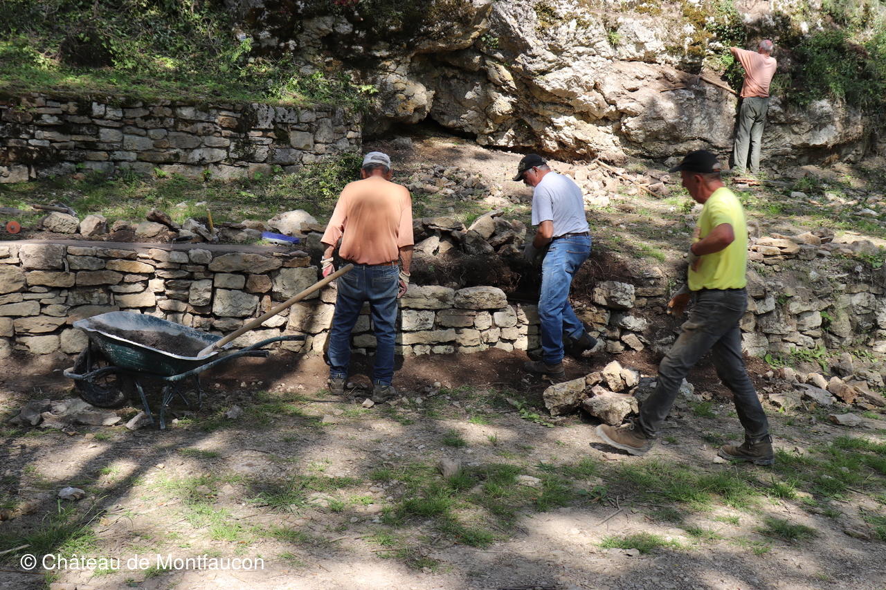 Lors des semaines de travaux au château de Montfaucon, une équipe a commencé à remettre en place le muret éboulé suite aux travaux des années précédentes. C'est un travail remarquable qu'ont effectué les bénévoles, tantôt maçons, tantôt jardiniers. Le muret n'est pas terminé, il reste encore quelques mètres à réaliser, mais le résultat est superbe. Les quatre premières photos montrent l'état de l'esplanade avant l'enlèvement des déblais; l'article ci-dessous vous en dira plus sur les travaux de déblaiement en septembre 2017 :