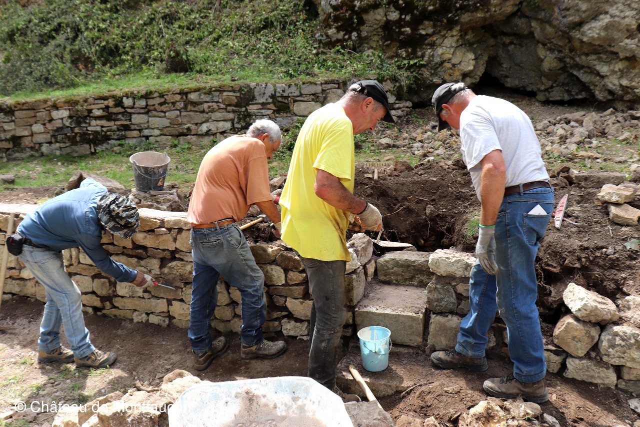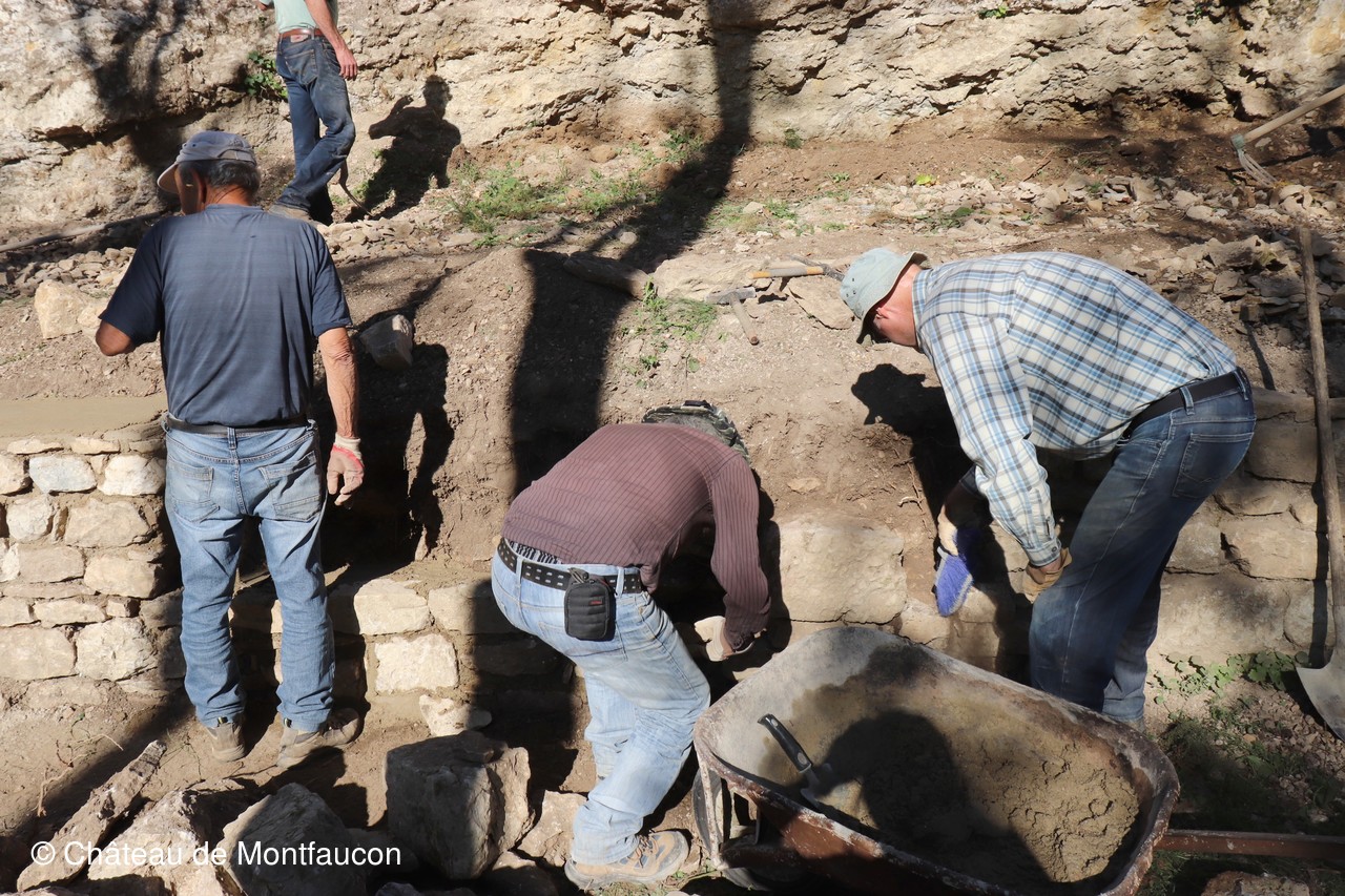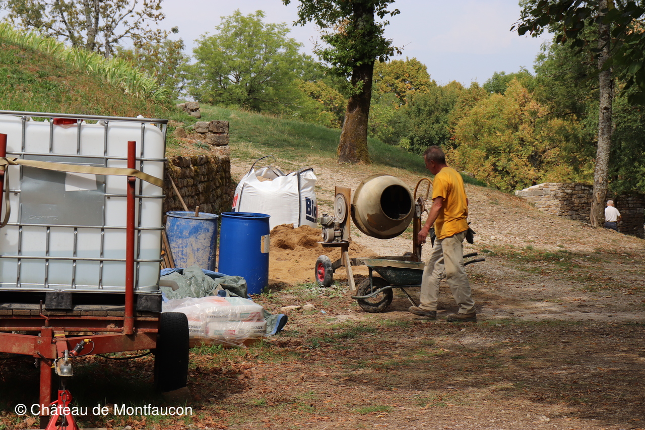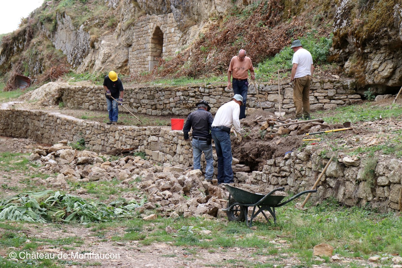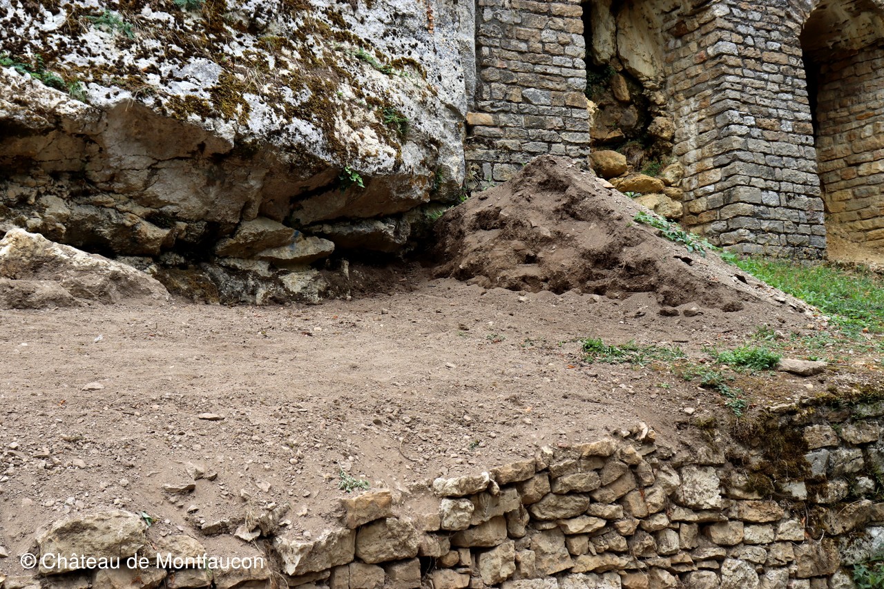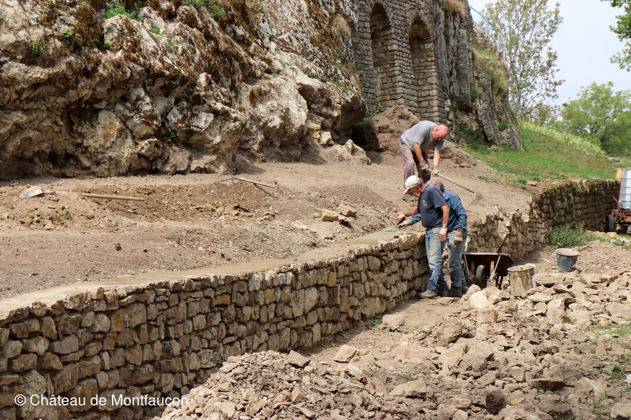 Lors des semaines de travaux au château de Montfaucon, une équipe a commencé à remettre en place le muret éboulé suite aux travaux des années précédentes. C'est un travail remarquable qu'ont effectué les bénévoles, tantôt maçons, tantôt jardiniers. Le muret n'est pas terminé, il reste encore quelques mètres à réaliser, mais le résultat est superbe. Les quatre premières photos montrent l'état de l'esplanade avant l'enlèvement des déblais; l'article ci-dessous vous en dira plus sur les travaux de déblaiement en septembre 2017 :