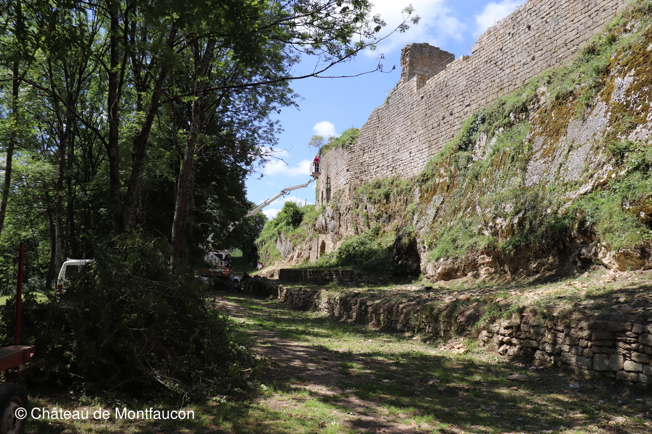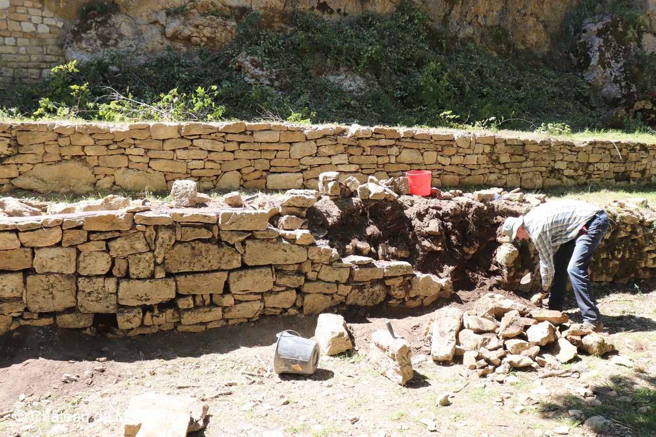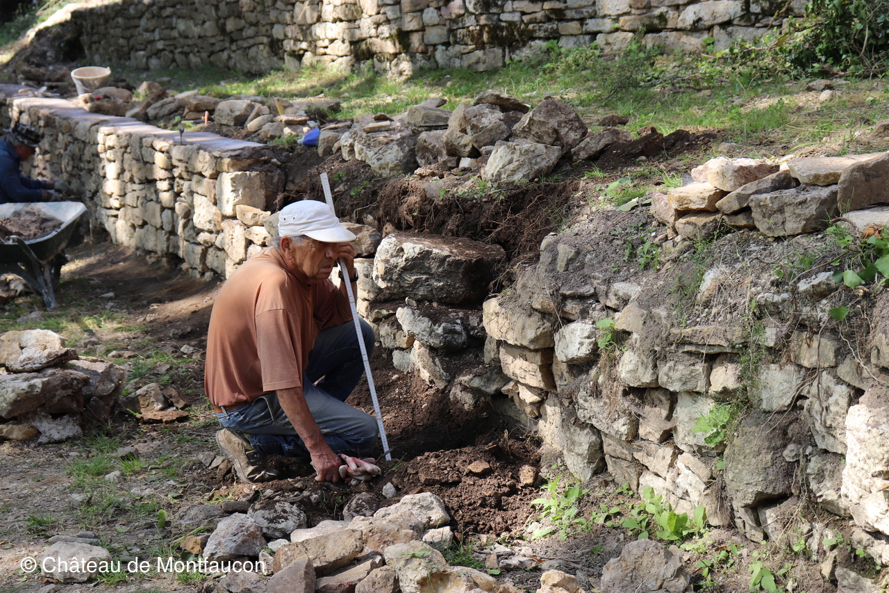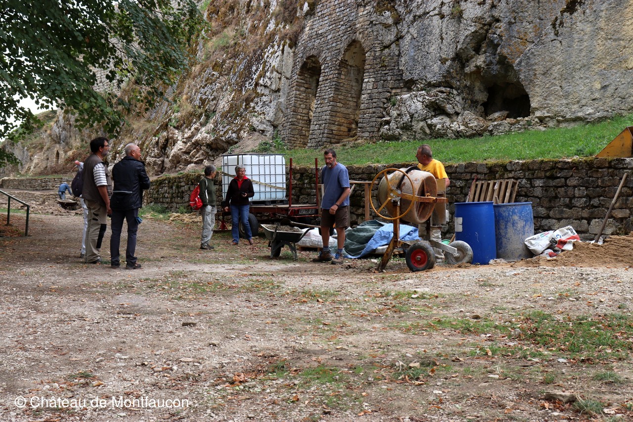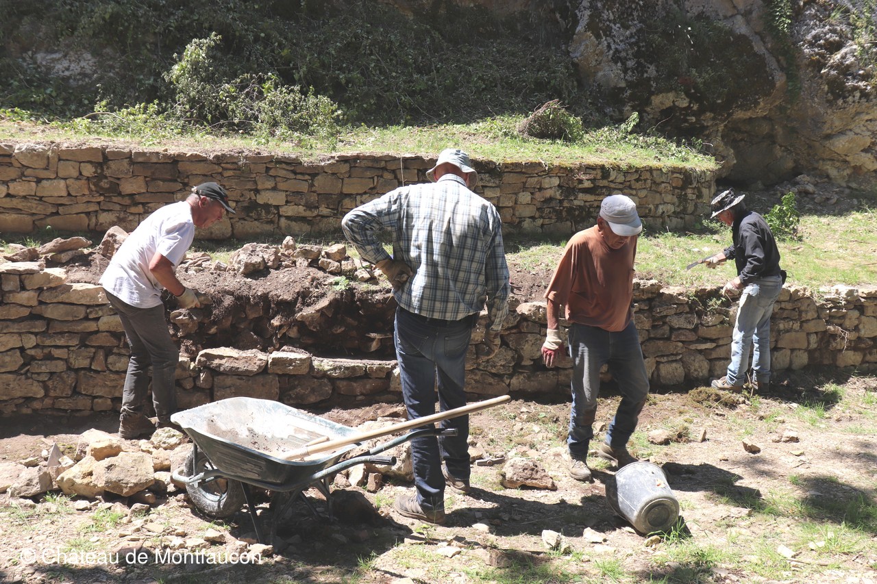 Lors des semaines de travaux au château de Montfaucon, une équipe a commencé à remettre en place le muret éboulé suite aux travaux des années précédentes. C'est un travail remarquable qu'ont effectué les bénévoles, tantôt maçons, tantôt jardiniers. Le muret n'est pas terminé, il reste encore quelques mètres à réaliser, mais le résultat est superbe. Les quatre premières photos montrent l'état de l'esplanade avant l'enlèvement des déblais; l'article ci-dessous vous en dira plus sur les travaux de déblaiement en septembre 2017 :