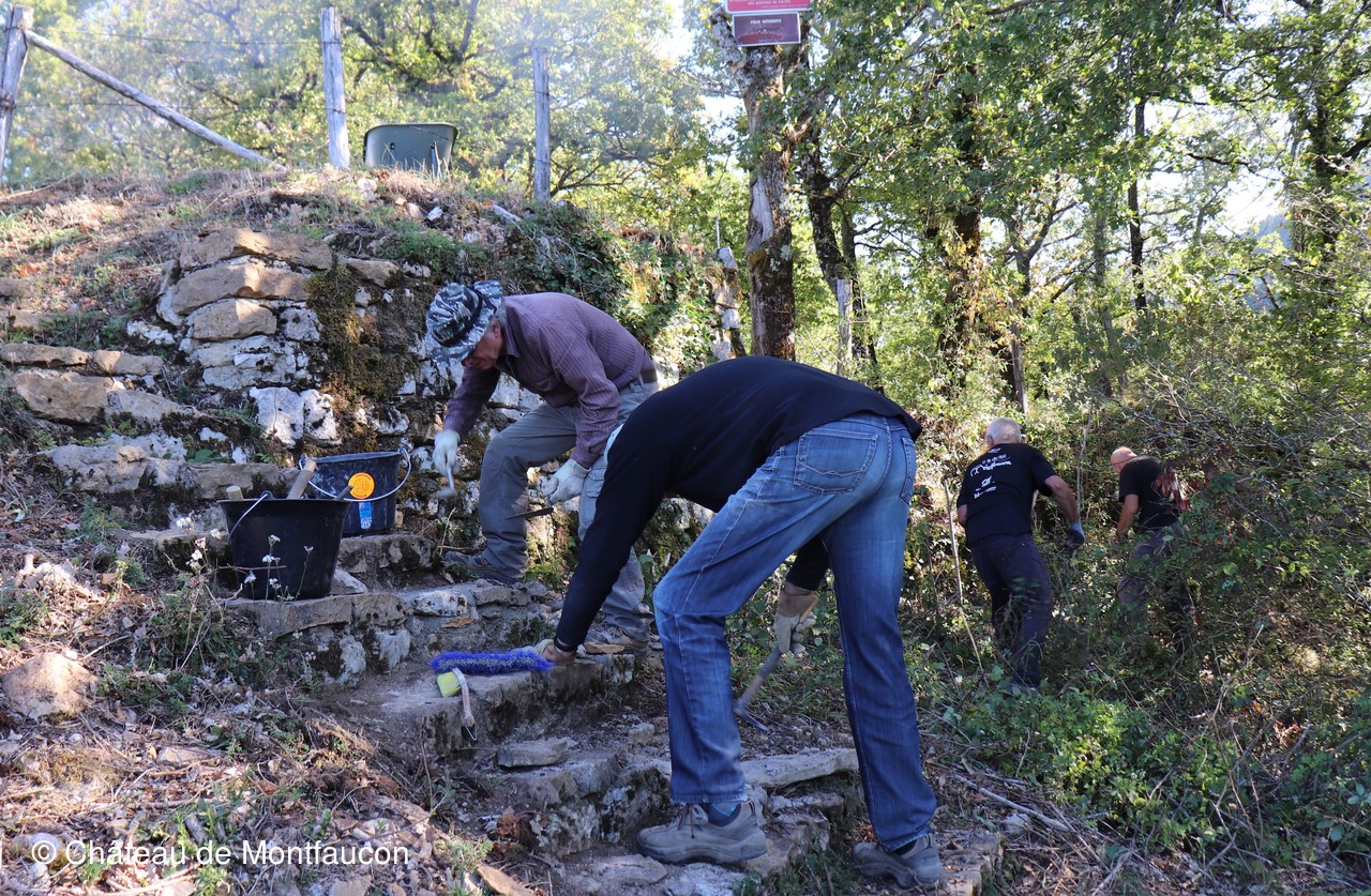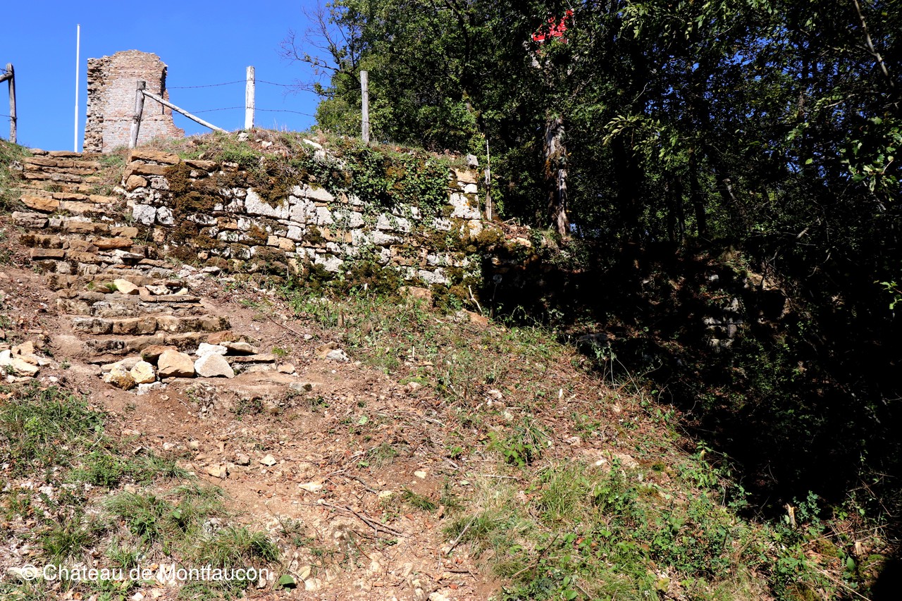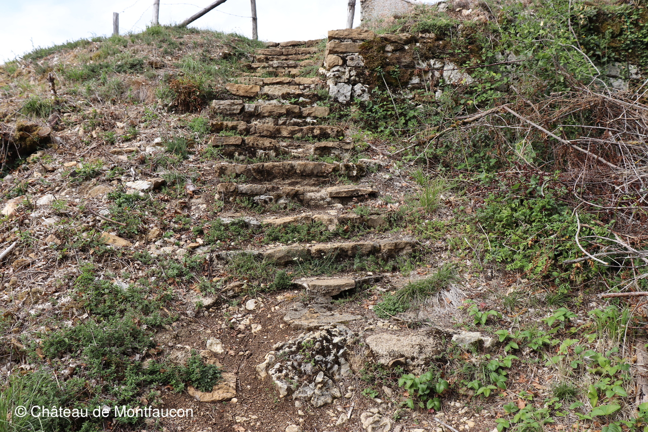 Parmi les travaux envisagés, et réalisables avec accord de la Commune, figurait la consolidation de l'escalier sud montant au donjon à partir du chemin de randonnée. Le travail a été réalisé.