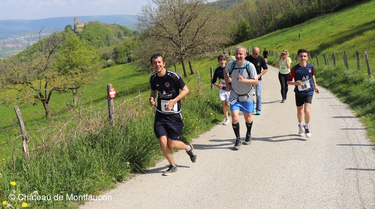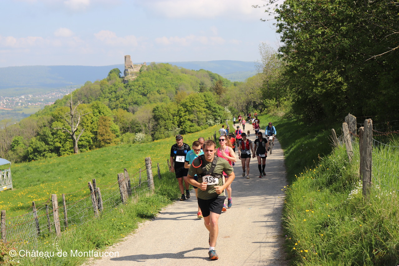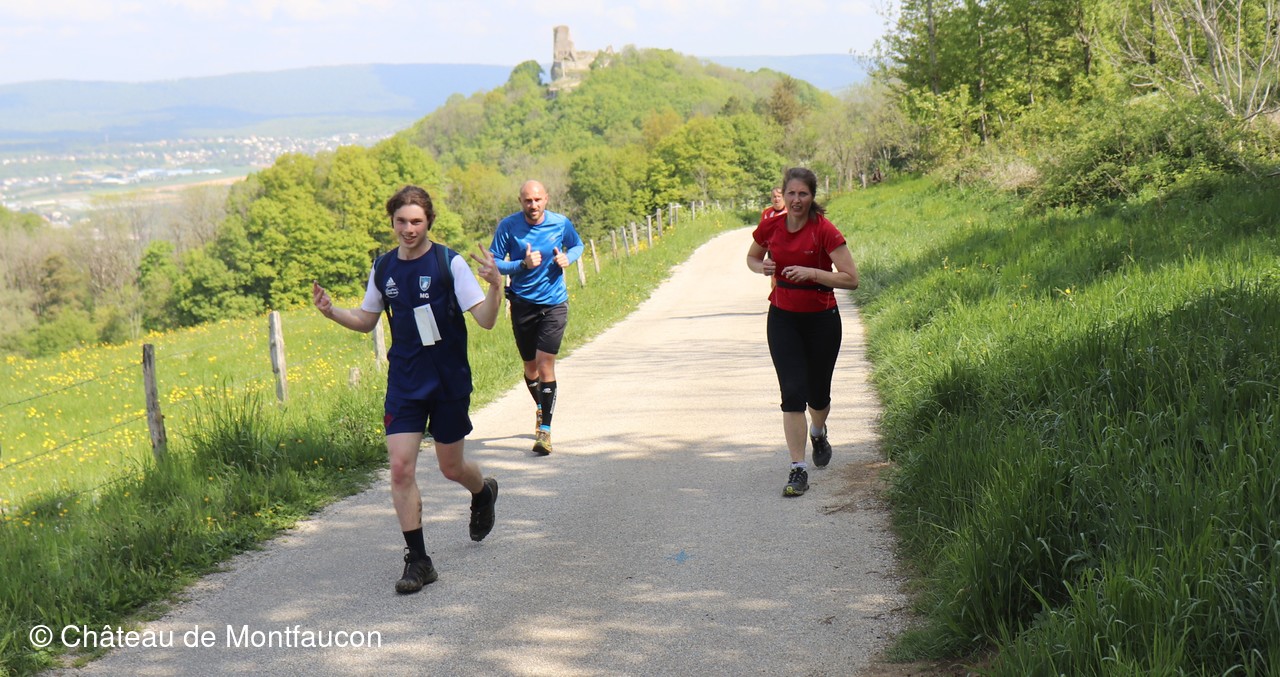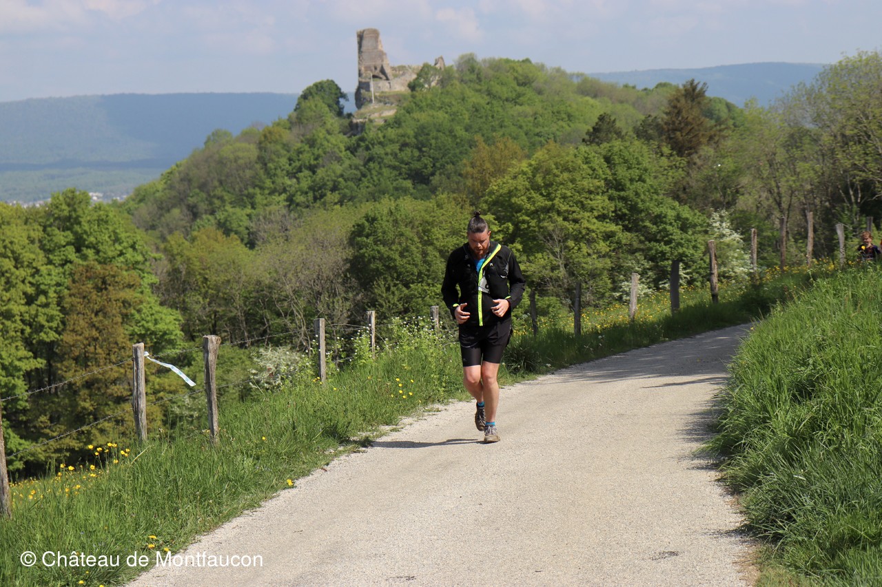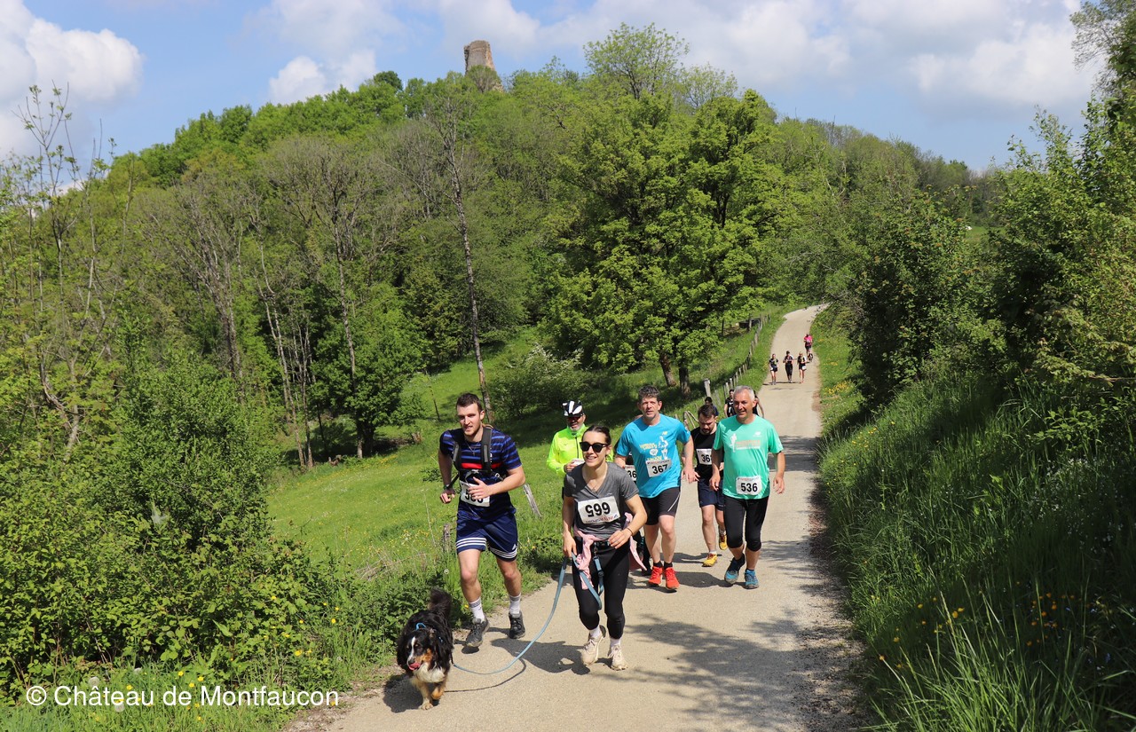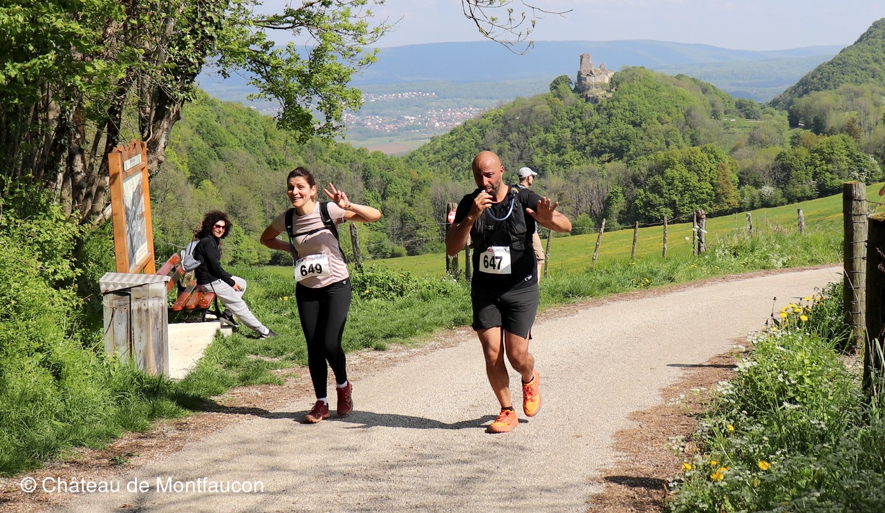 Le Trail de Montfaucon est passé par le château de Montfaucon puis les participants ont emprunté le chemin du Donjon qui mènait à l'arrivée (salle d'accueil). Malgré une montée un peu raide sur la fin, les sourires et les petits gestes de remerciements étaient au rendez-vous. Au fond du vallon, le donjon se dressait fièrement comme pour saluer sympathiquement marcheurs et coureurs.