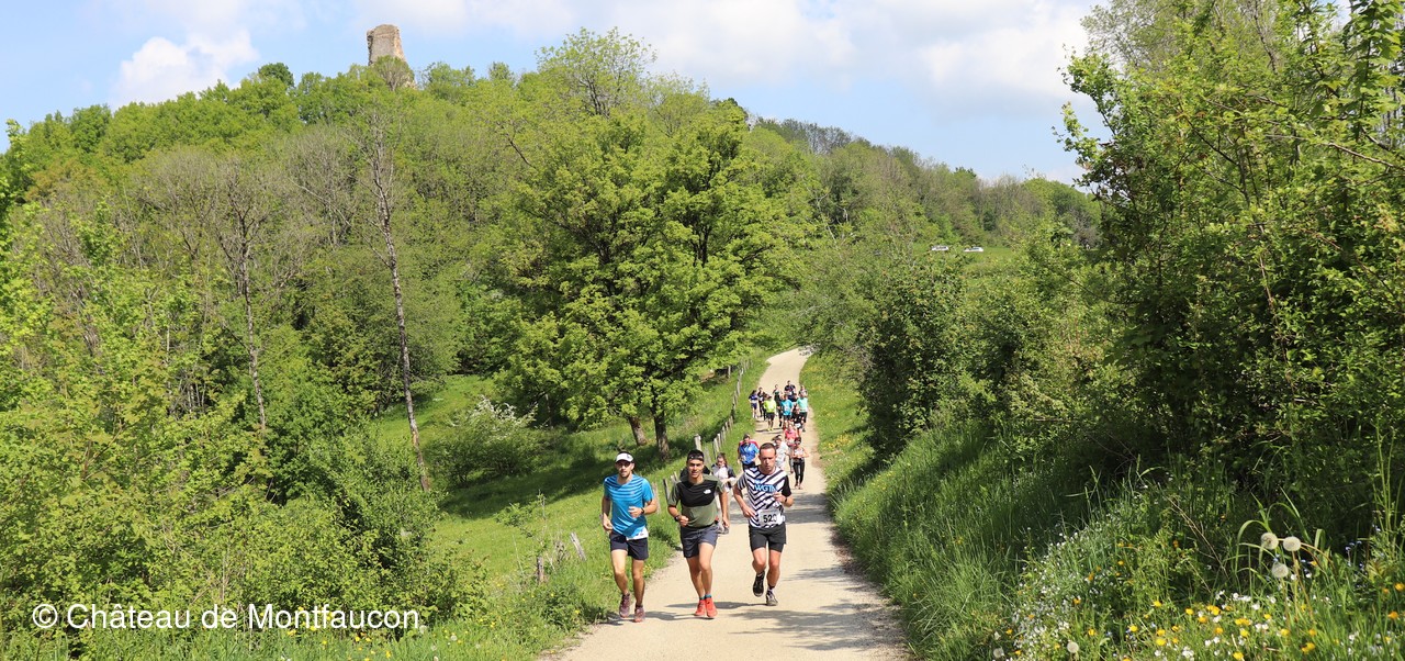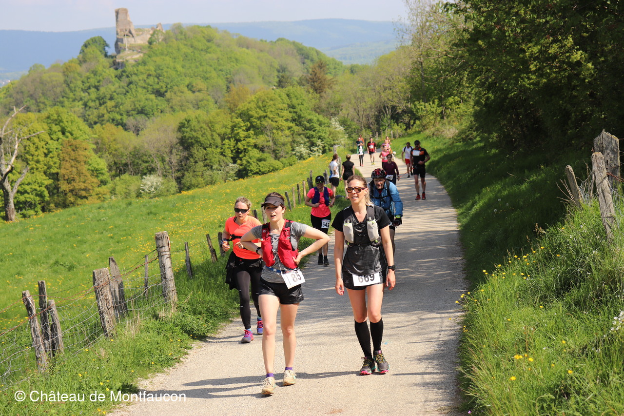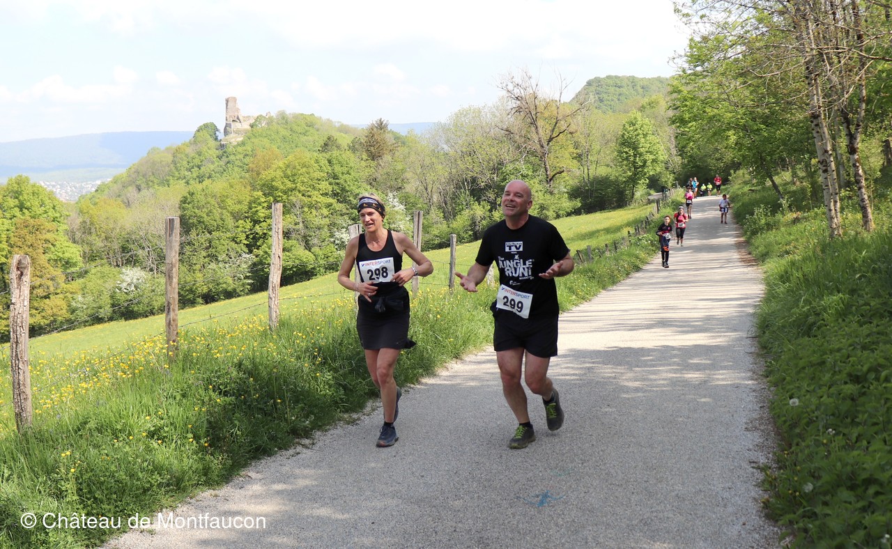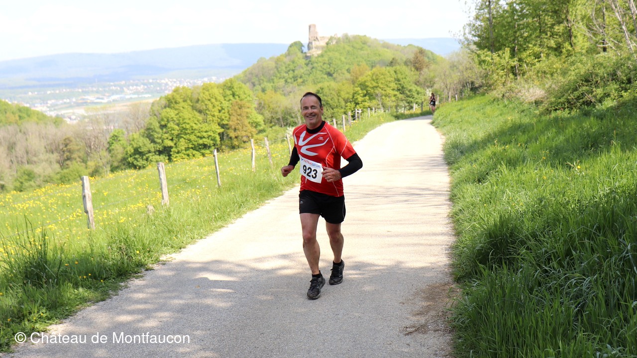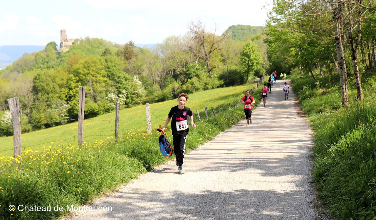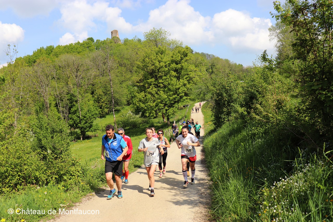 Le Trail de Montfaucon est passé par le château de Montfaucon puis les participants ont emprunté le chemin du Donjon qui mènait à l'arrivée (salle d'accueil). Malgré une montée un peu raide sur la fin, les sourires et les petits gestes de remerciements étaient au rendez-vous. Au fond du vallon, le donjon se dressait fièrement comme pour saluer sympathiquement marcheurs et coureurs.