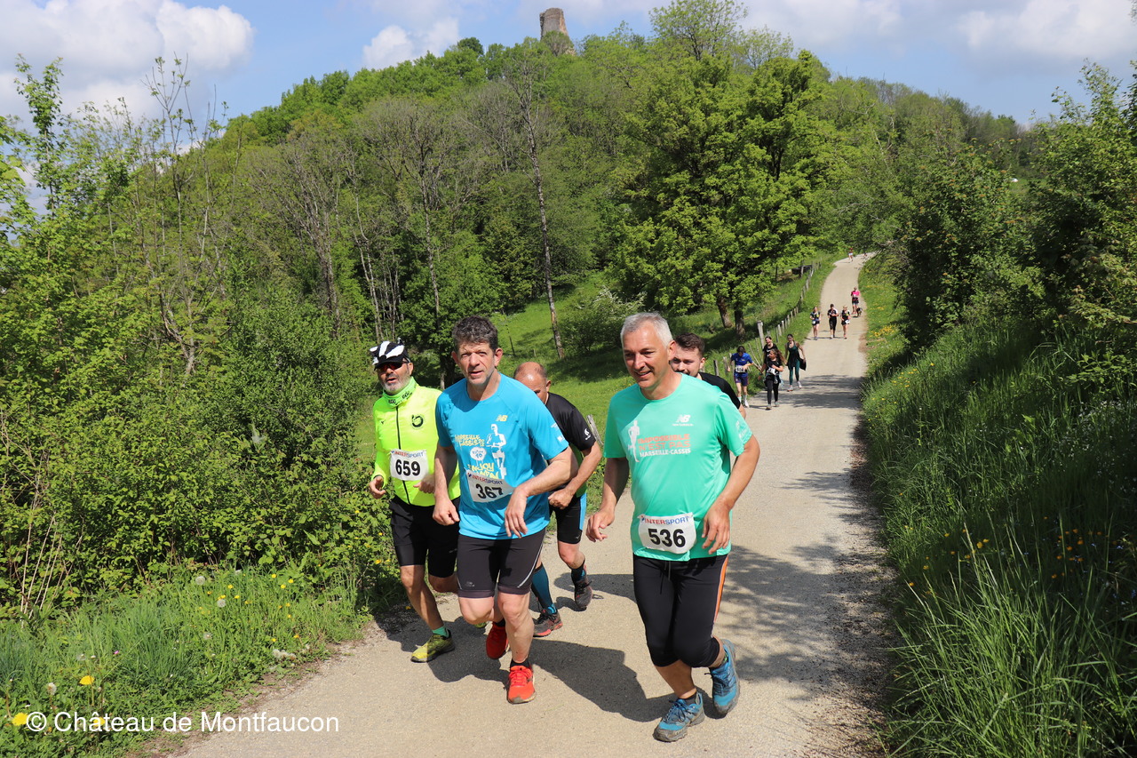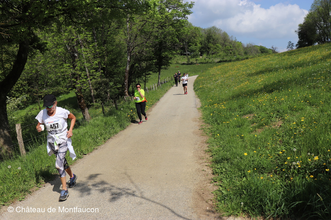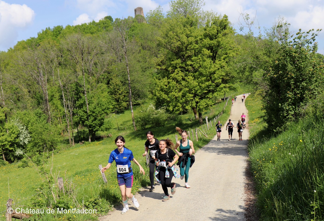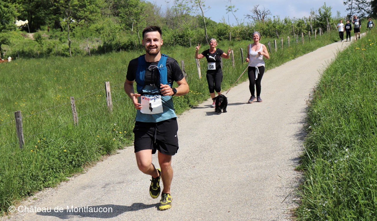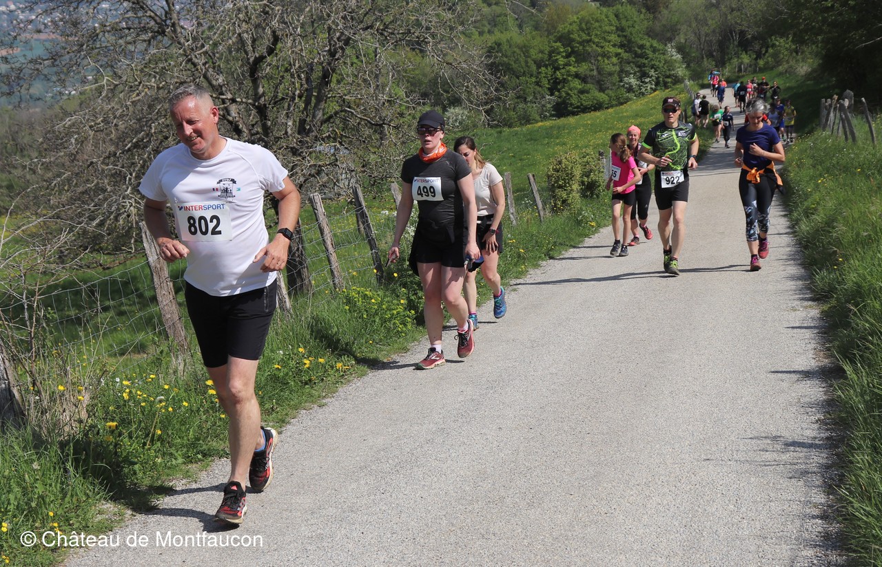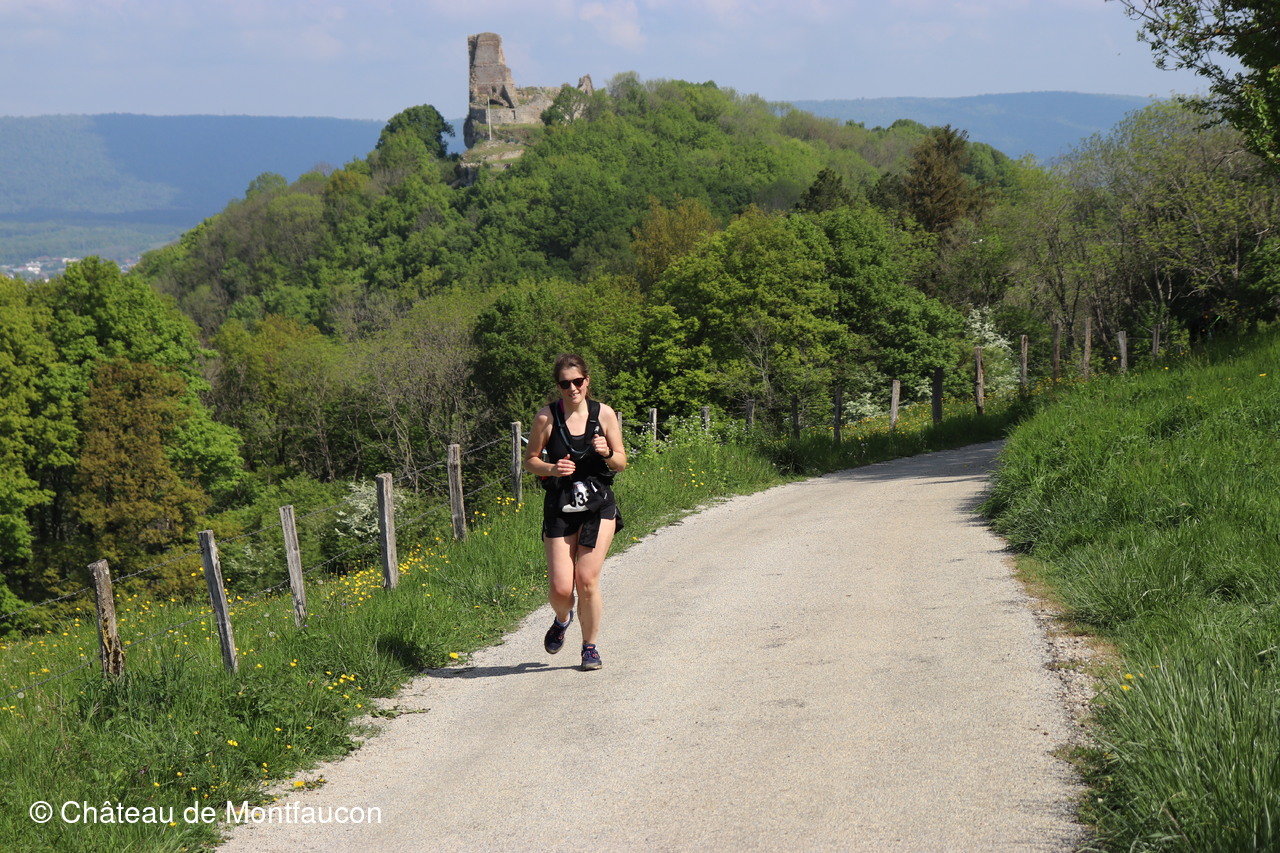 Le Trail de Montfaucon est passé par le château de Montfaucon puis les participants ont emprunté le chemin du Donjon qui mènait à l'arrivée (salle d'accueil). Malgré une montée un peu raide sur la fin, les sourires et les petits gestes de remerciements étaient au rendez-vous. Au fond du vallon, le donjon se dressait fièrement comme pour saluer sympathiquement marcheurs et coureurs.