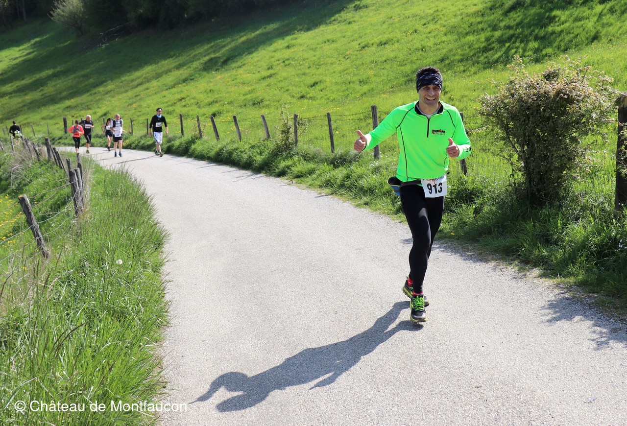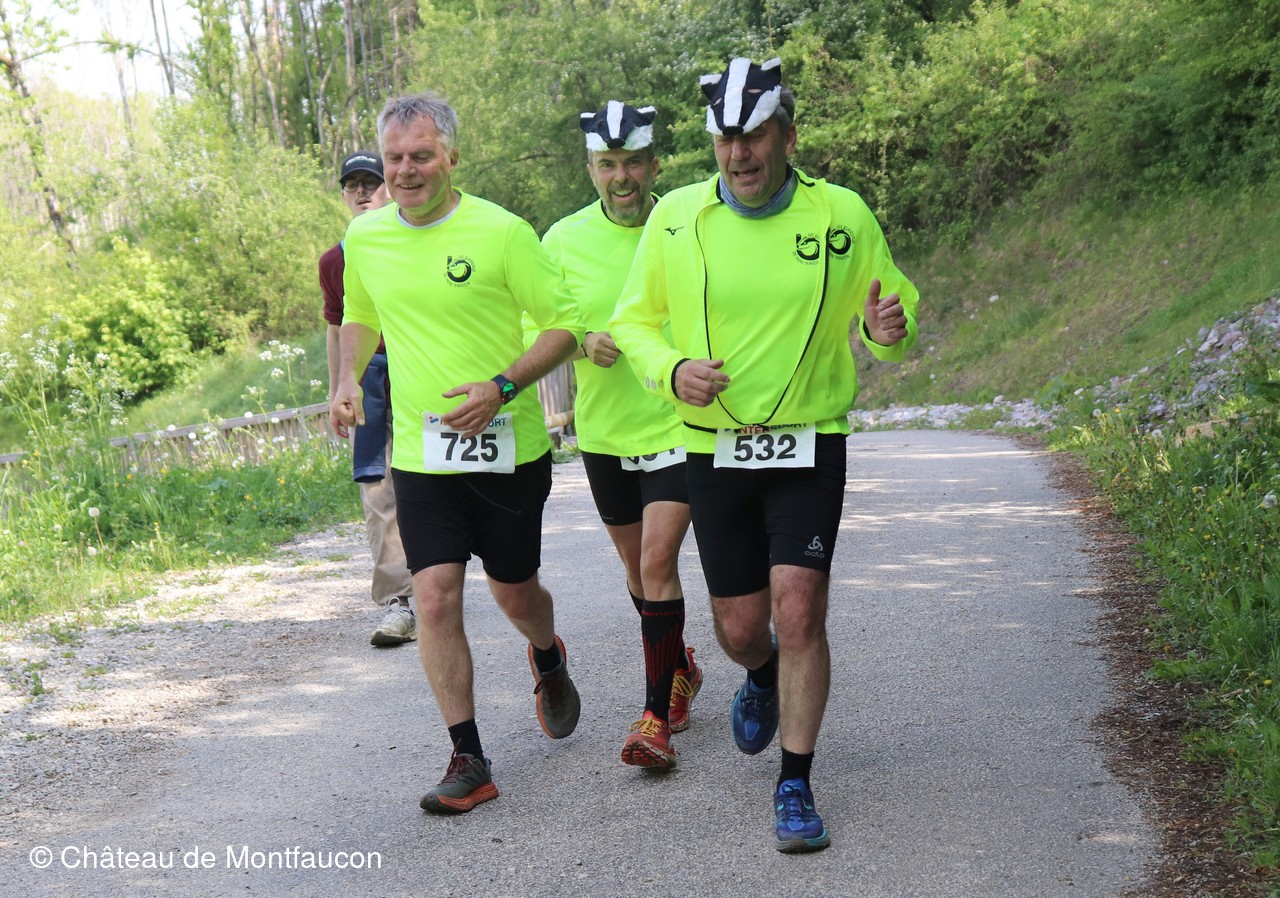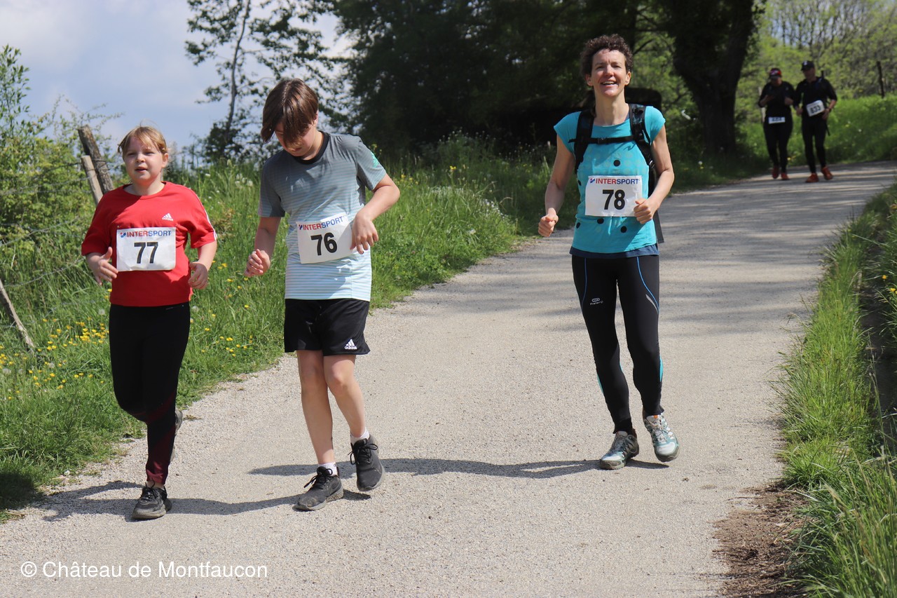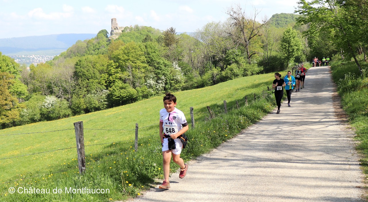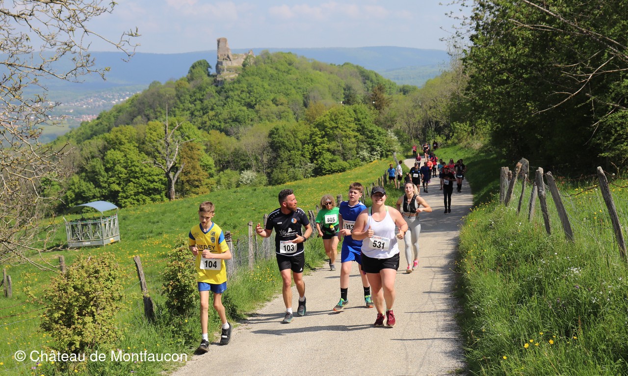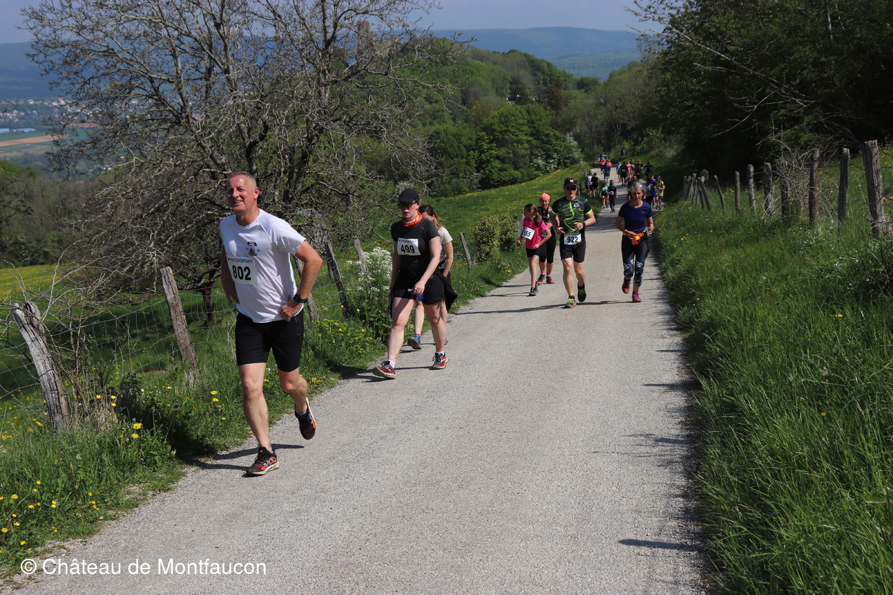 Le Trail de Montfaucon est passé par le château de Montfaucon puis les participants ont emprunté le chemin du Donjon qui mènait à l'arrivée (salle d'accueil). Malgré une montée un peu raide sur la fin, les sourires et les petits gestes de remerciements étaient au rendez-vous. Au fond du vallon, le donjon se dressait fièrement comme pour saluer sympathiquement marcheurs et coureurs.