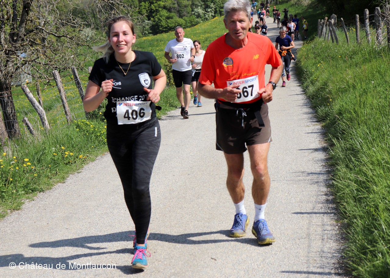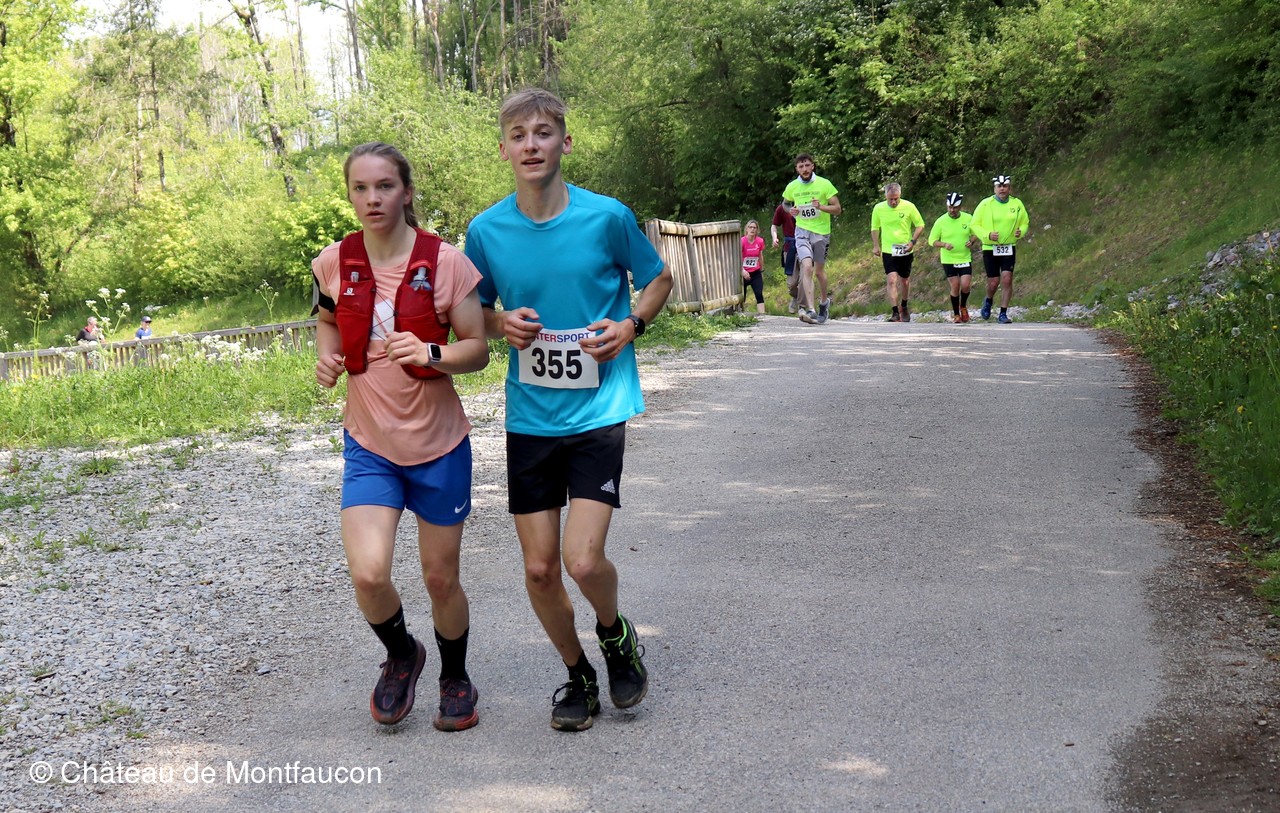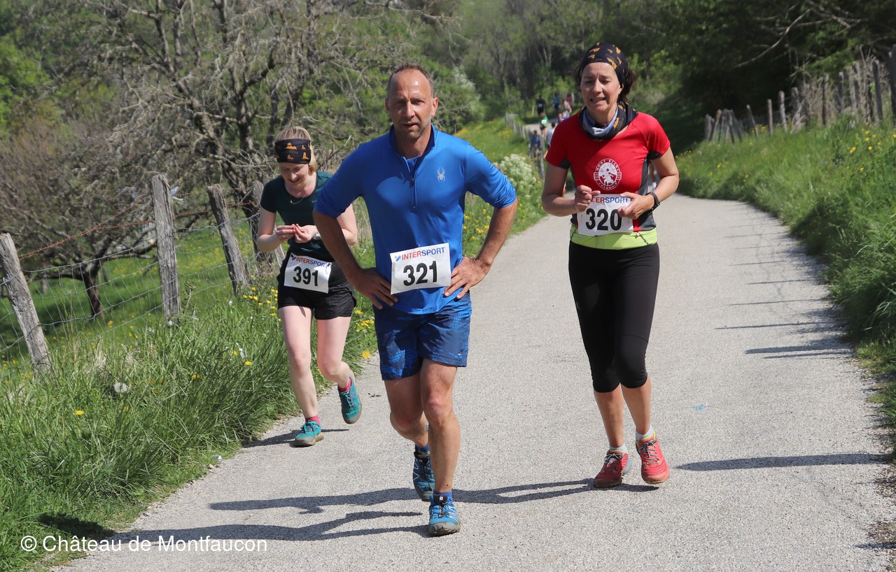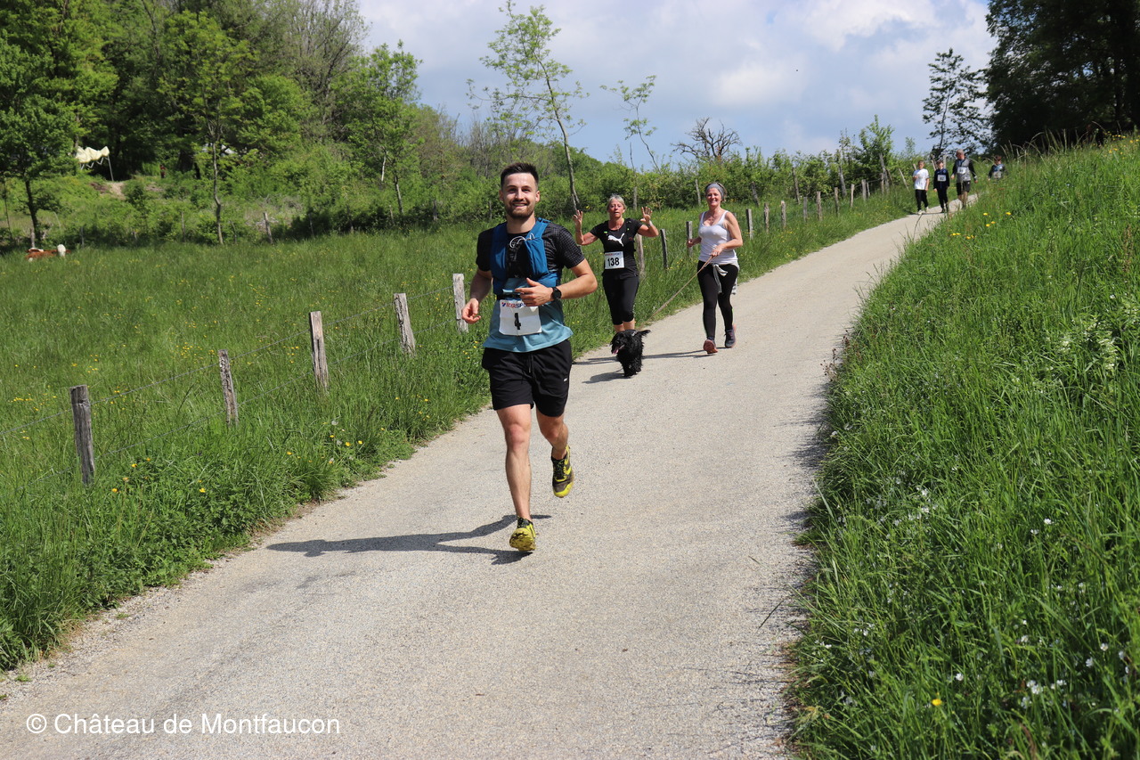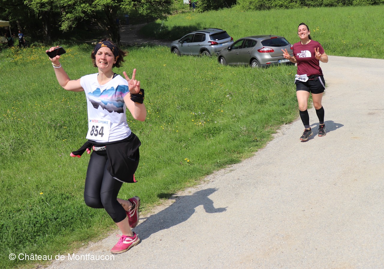 Le Trail de Montfaucon est passé par le château de Montfaucon puis les participants ont emprunté le chemin du Donjon qui mènait à l'arrivée (salle d'accueil). Malgré une montée un peu raide sur la fin, les sourires et les petits gestes de remerciements étaient au rendez-vous. Au fond du vallon, le donjon se dressait fièrement comme pour saluer sympathiquement marcheurs et coureurs.