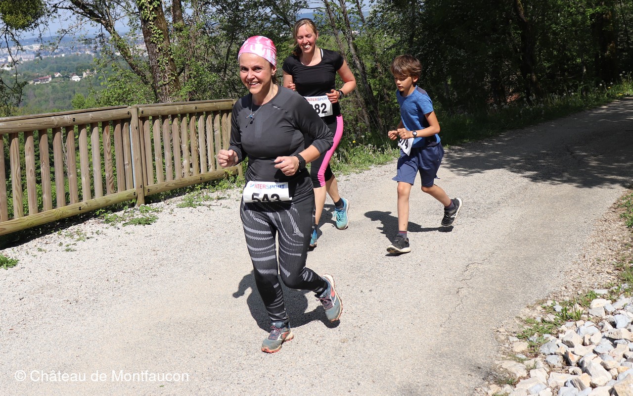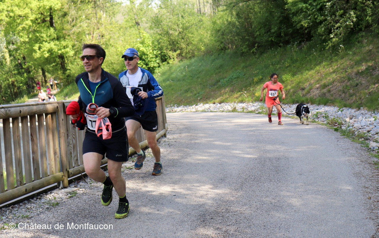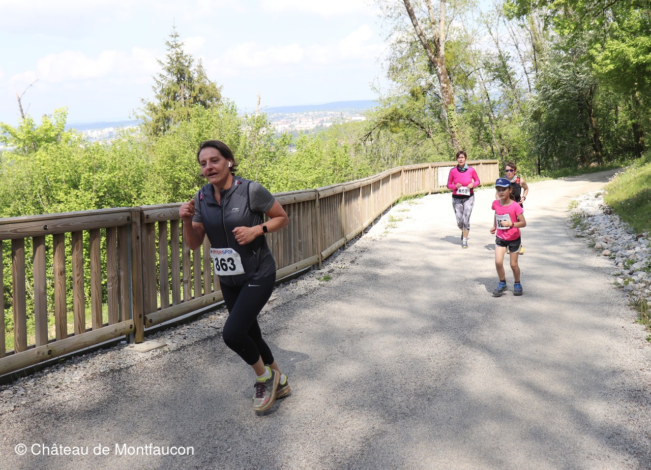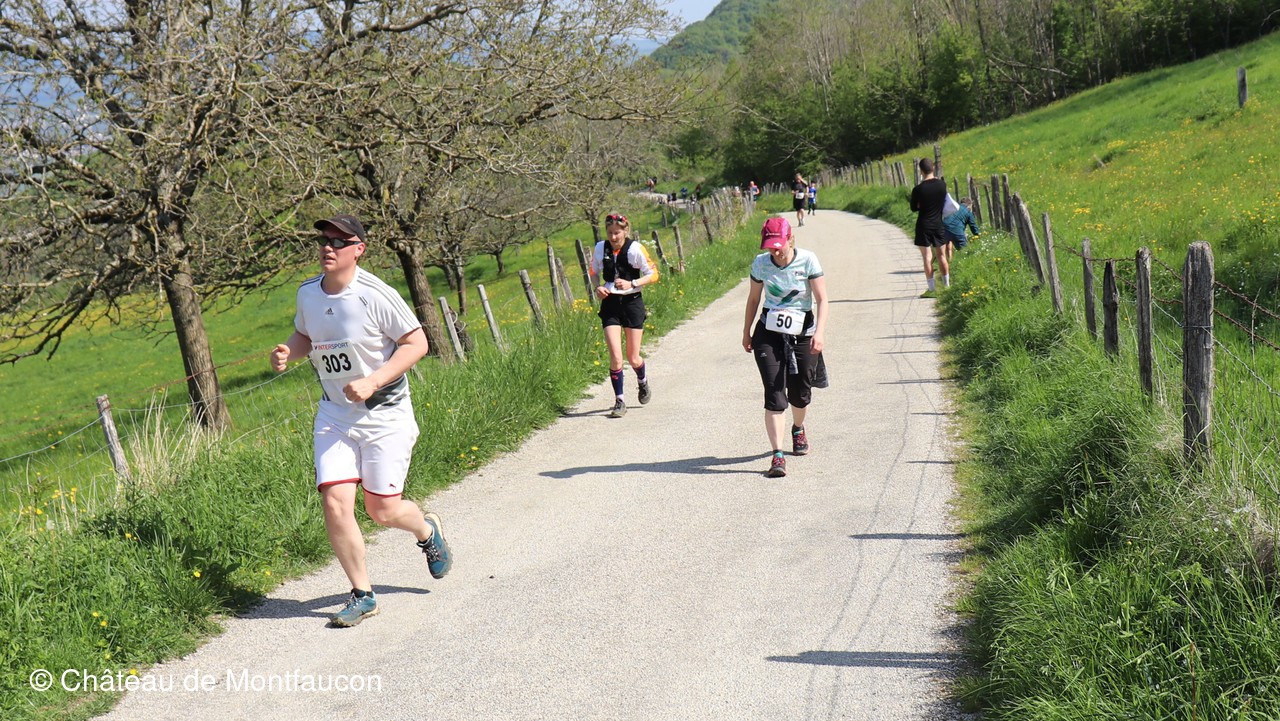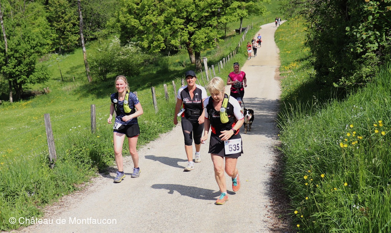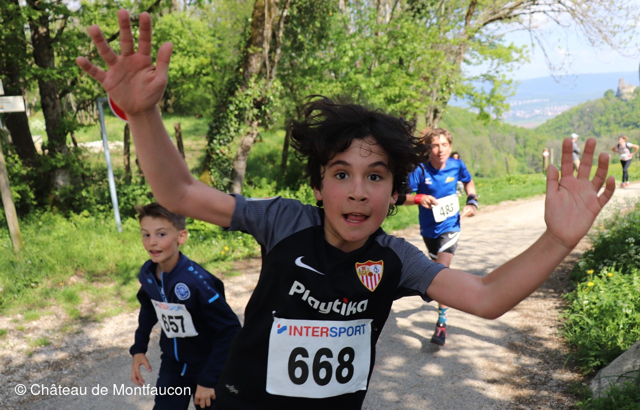 Le Trail de Montfaucon est passé par le château de Montfaucon puis les participants ont emprunté le chemin du Donjon qui mènait à l'arrivée (salle d'accueil). Malgré une montée un peu raide sur la fin, les sourires et les petits gestes de remerciements étaient au rendez-vous. Au fond du vallon, le donjon se dressait fièrement comme pour saluer sympathiquement marcheurs et coureurs.