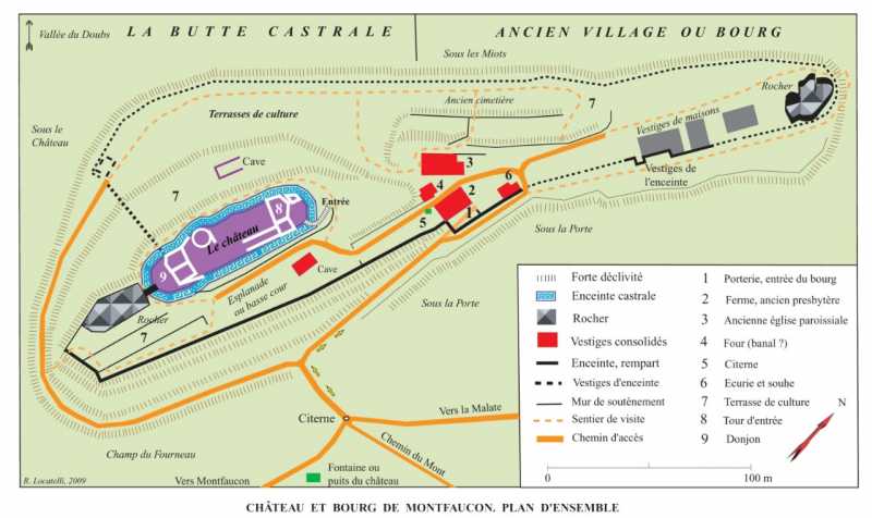 Le paysage actuel ne correspond plus à celui du Moyen Age, car la végétation arbustive a envahi toutes les pentes et même le fond du vallon, alors que jusqu’à la fin du IXe siècle les pâturages tapissaient la combe et que les vignes couvraient tous les versants. Il suffit de se reporter au cadastre dit napoléonien, dressé en 1834, pour se rendre compte de cette évolution paysagère. Les bois n’occupent que le pied abrupt de la falaise (Bois de la Roche) et le secteur de la Roche d’Arbois présentant lui aussi une très forte déclivité. Partout ailleurs, des prés, des champs et des vignes, celles‑ci se distinguant par le maillage très fin du parcellaire. Cette situation perdure encore au début du XXe siècle, quand le bisontin Henri-Eugène Savoie achète à la commune de Montfaucon le site du château : la carte dressée lors de cette transaction montre que toutes les petites parcelles du versant occidental portent des toponymes se référant à la vigne, alors que celles de dimensions plus grandes sont des prés ou des champs.